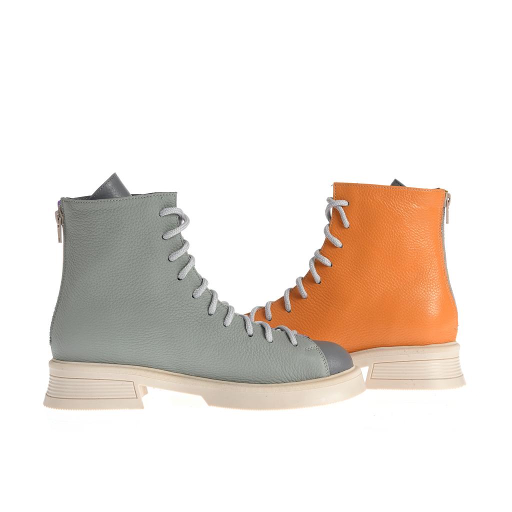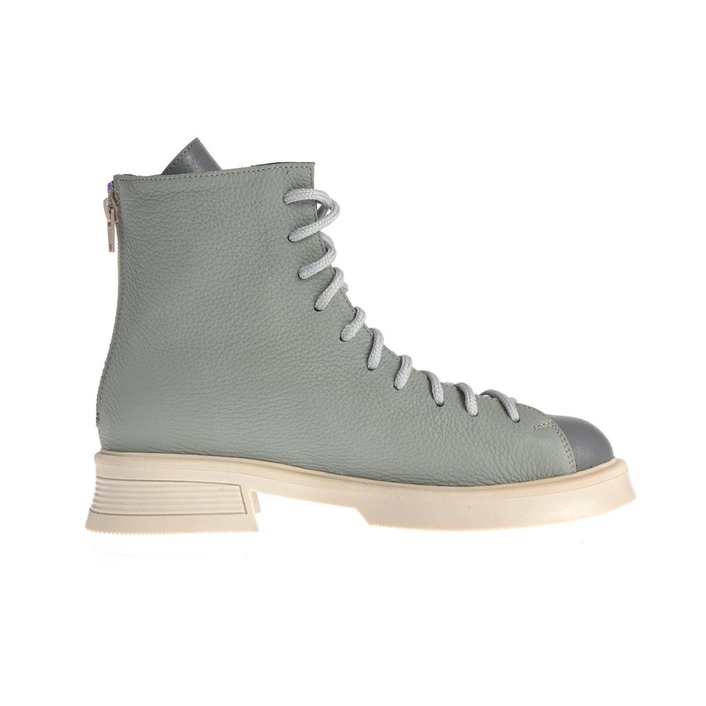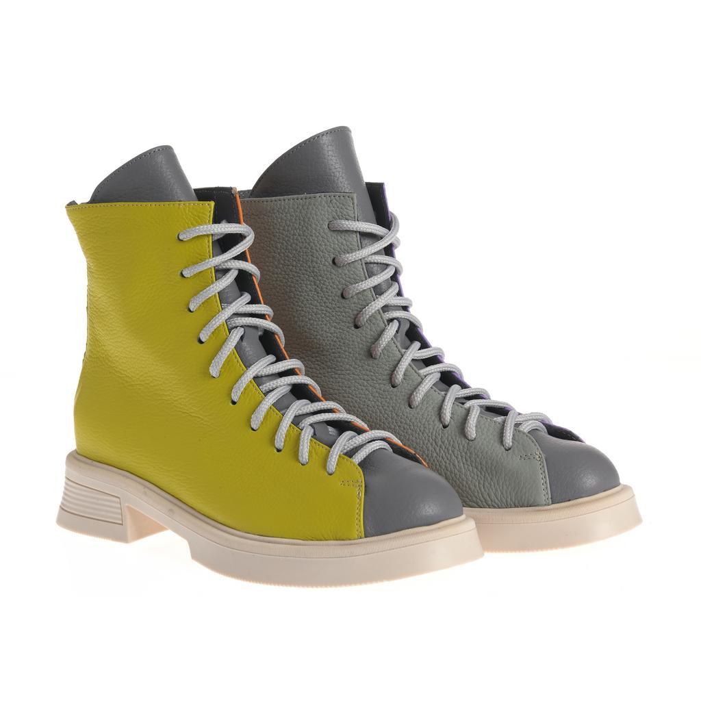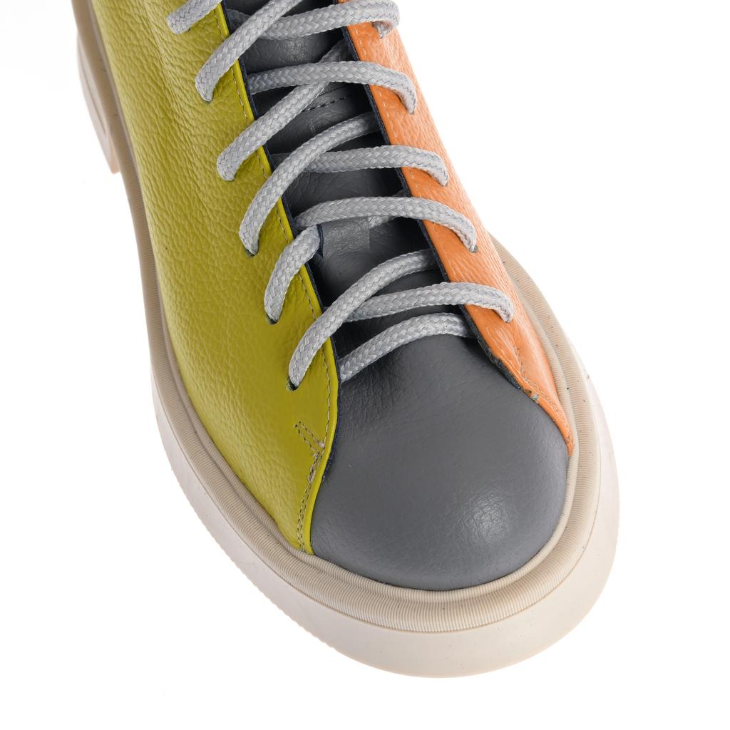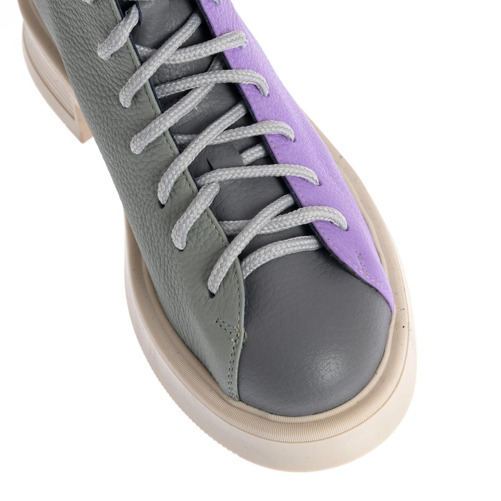 Model cu acoperire înaltă la gleznă, realizat din piele și pus în valoare de contrastul cromatic dintre panouri și de liniile bine definite ale designului. Sistemul de închidere combină șireturi și fermoar la spate, pentru ajustare rapidă și susținere. Talpa plată, cu model de aderență de bază, alături de tocul jos, tip bloc, oferă stabilitate la purtare. Căptușeala din piele naturală adaugă un plus de confort, iar vârful rotund menține o linie lejeră, potrivită pentru purtare de zi cu zi în contexte urbane.