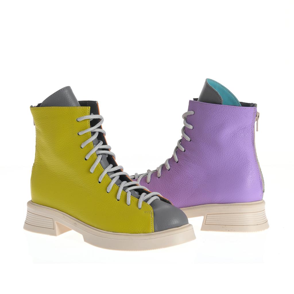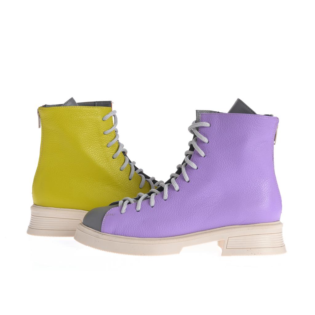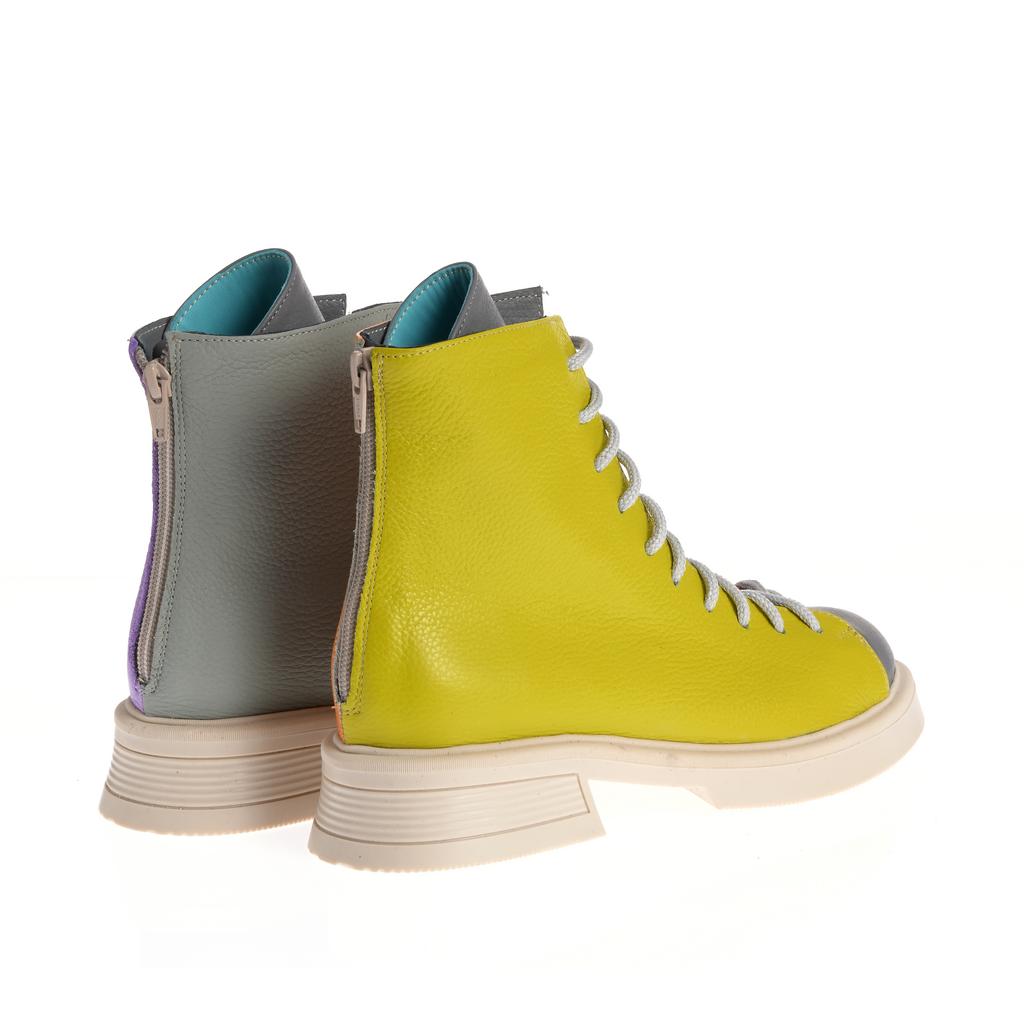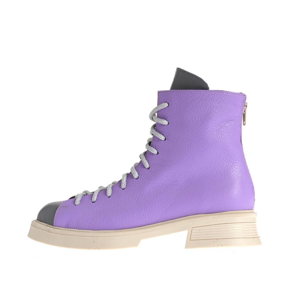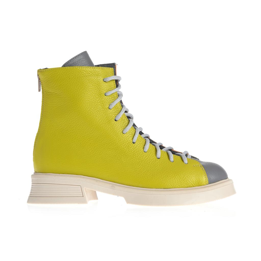 Model cu acoperire înaltă la gleznă, realizat din piele și pus în valoare de contrastul cromatic dintre panouri și de liniile bine definite ale designului. Sistemul de închidere combină șireturi și fermoar la spate, pentru ajustare rapidă și susținere. Talpa plată, cu model de aderență de bază, alături de tocul jos, tip bloc, oferă stabilitate la purtare. Căptușeala din piele naturală adaugă un plus de confort, iar vârful rotund menține o linie lejeră, potrivită pentru purtare de zi cu zi în contexte urbane.