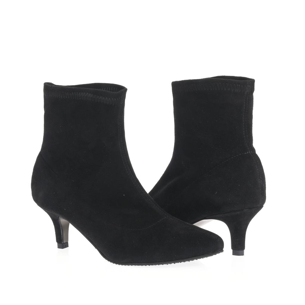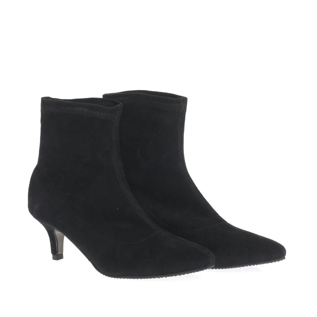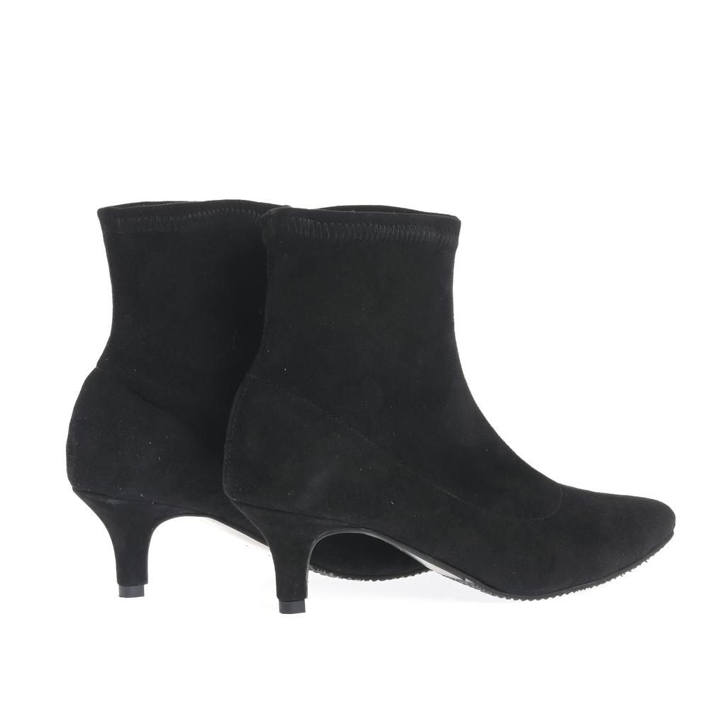 Botine din piele întoarsă, cu design minimalist și cusături vizibile. Model slip-on, cu vârf ascuțit și toc stiletto mediu, ușor de integrat în ținute elegante sau moderne.