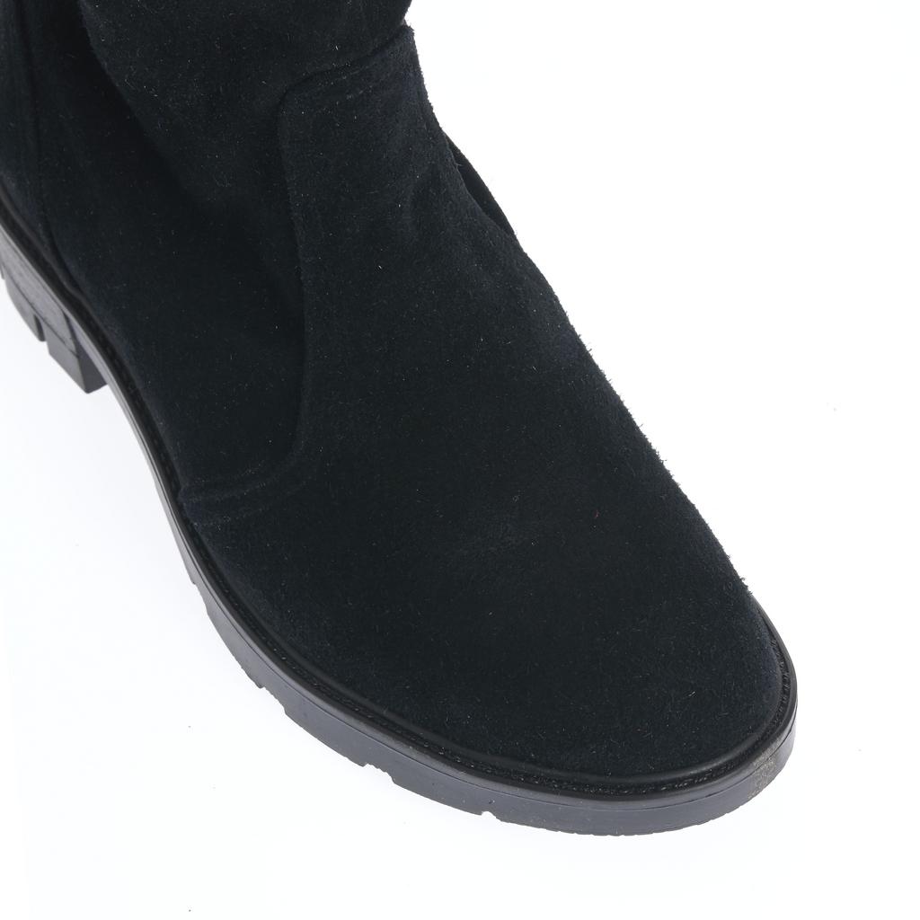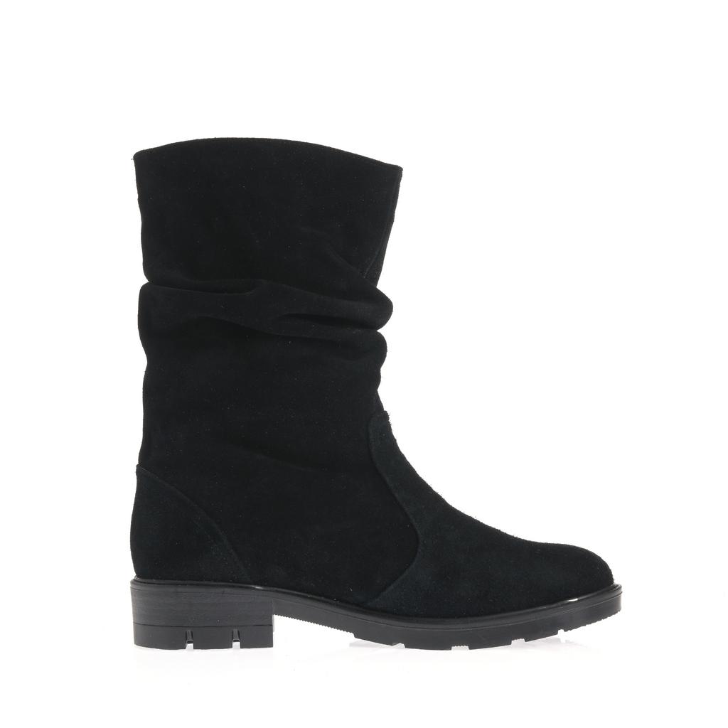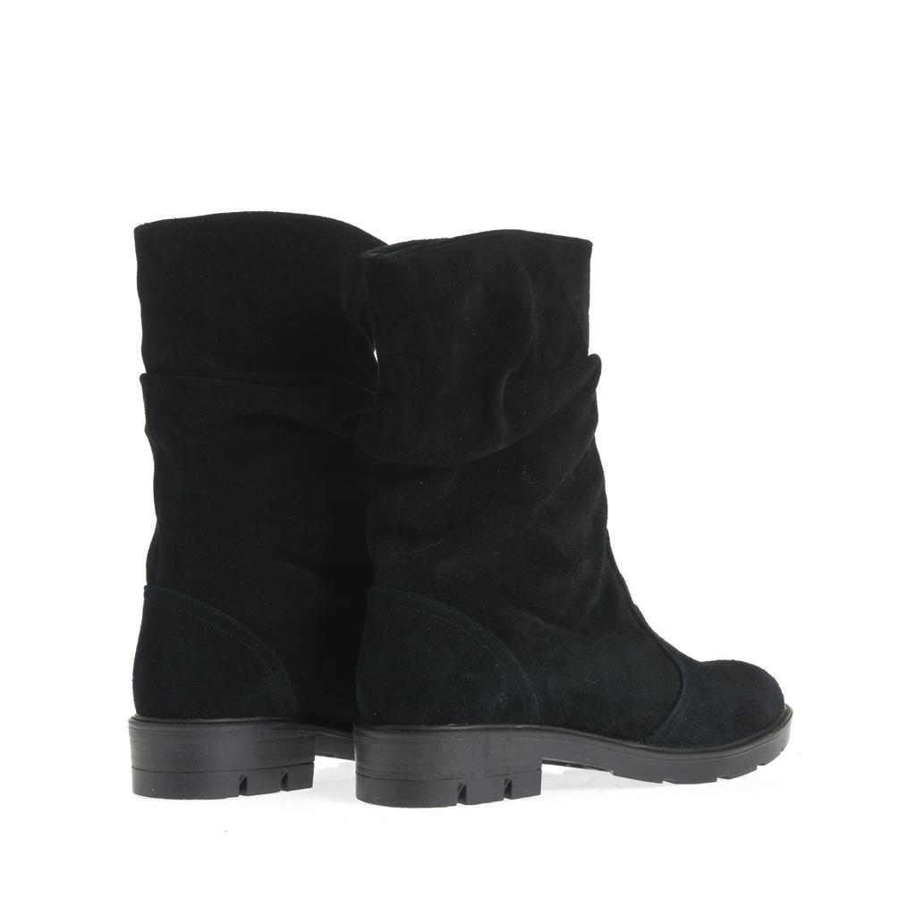 Model fără șiret, realizat din piele întoarsă, cu partea superioară lejeră și pliuri naturale ce adaugă dinamism designului. Talpa groasă, cu profil accentuat, susține stabilitatea la mers, iar tocul jos, drept, oferă confort la purtare. Vârful rotunjit și liniile simple definesc un model ușor de integrat în ținute de zi cu zi, pentru un stil relaxat și actual.