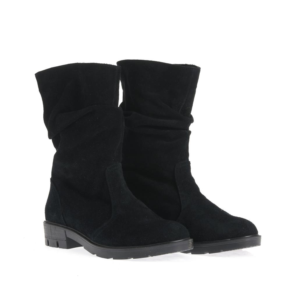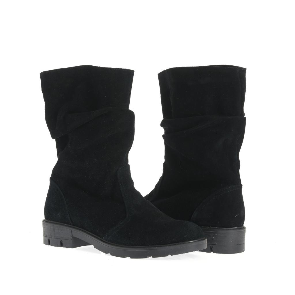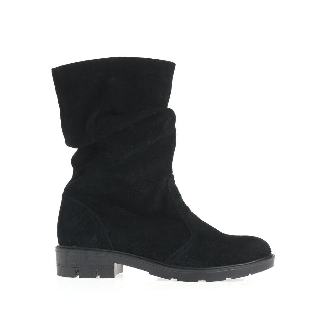 Model fără șiret, realizat din piele întoarsă, cu partea superioară lejeră și pliuri naturale ce adaugă dinamism designului. Talpa groasă, cu profil accentuat, susține stabilitatea la mers, iar tocul jos, drept, oferă confort la purtare. Vârful rotunjit și liniile simple definesc un model ușor de integrat în ținute de zi cu zi, pentru un stil relaxat și actual.