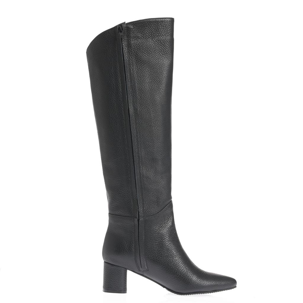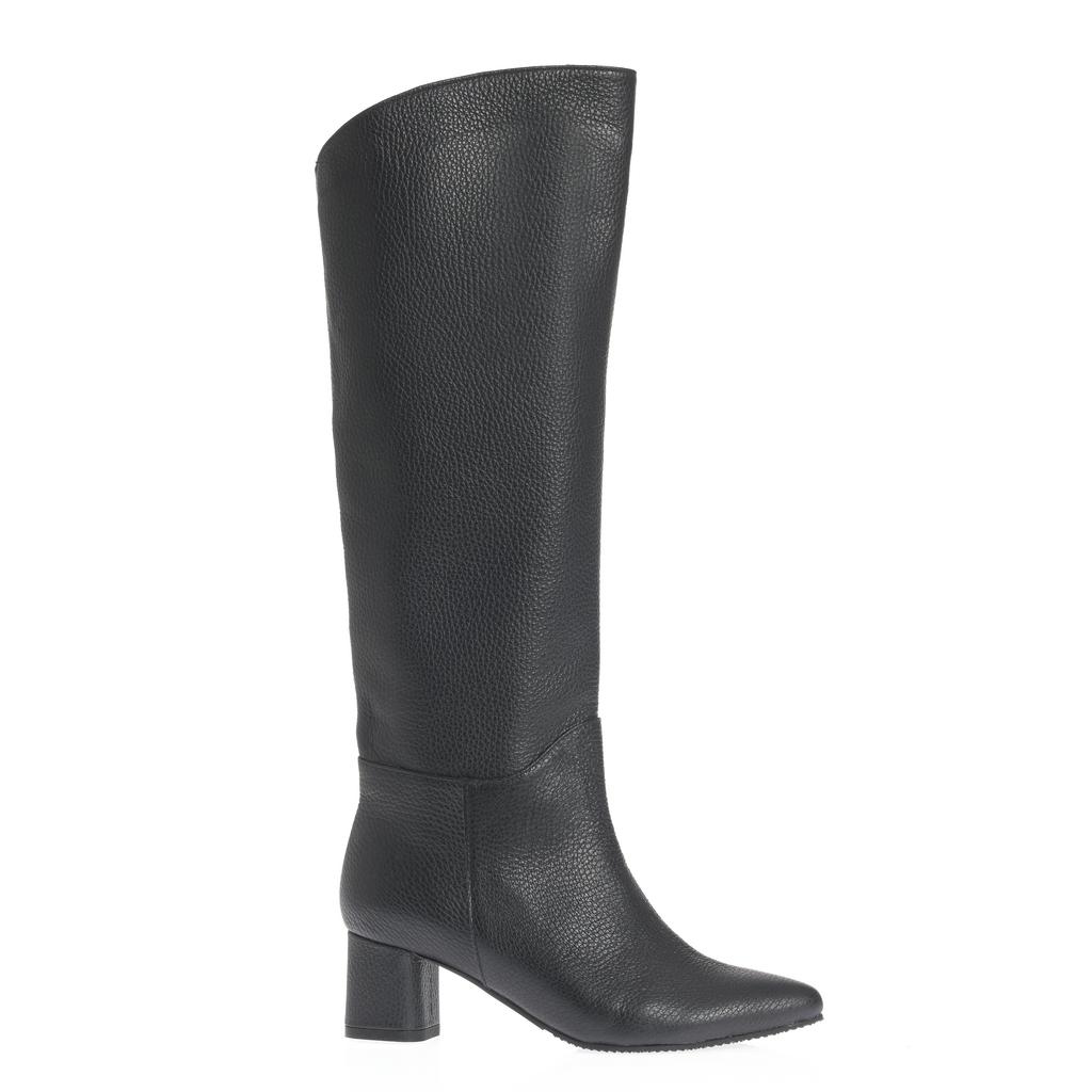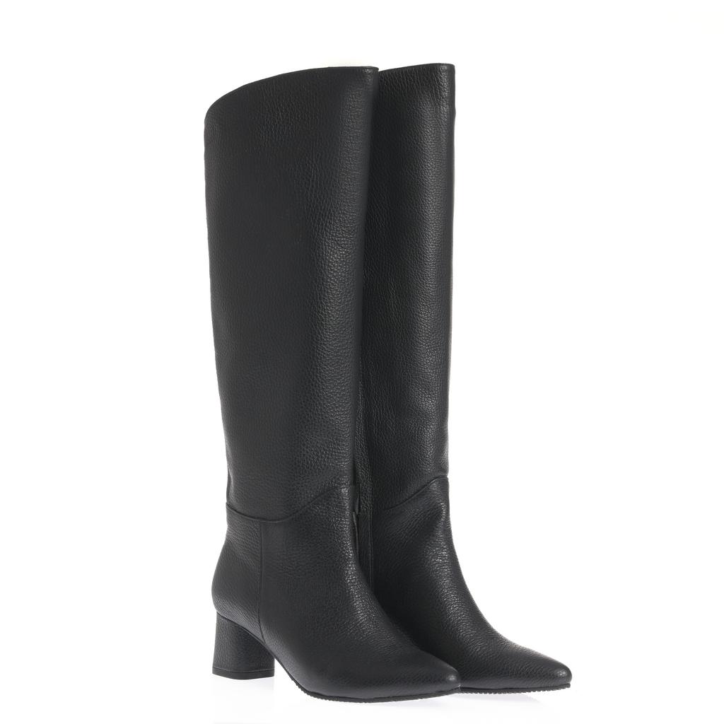 Aceste cizme până la genunchi sunt realizate din piele naturală texturată și au un design minimalist, pus în valoare prin panourile atent conturate și finisajele îngrijite. Vârful ascuțit și tocul gros, de înălțime medie, conturează o siluetă elegantă, potrivită pentru ținute moderne. Fermoarul lateral facilitează încălțarea și fixarea pe picior, iar liniile simple ale modelului le fac ușor de integrat în combinații cu rochii, fuste sau pantaloni mulați, pentru un look rafinat.