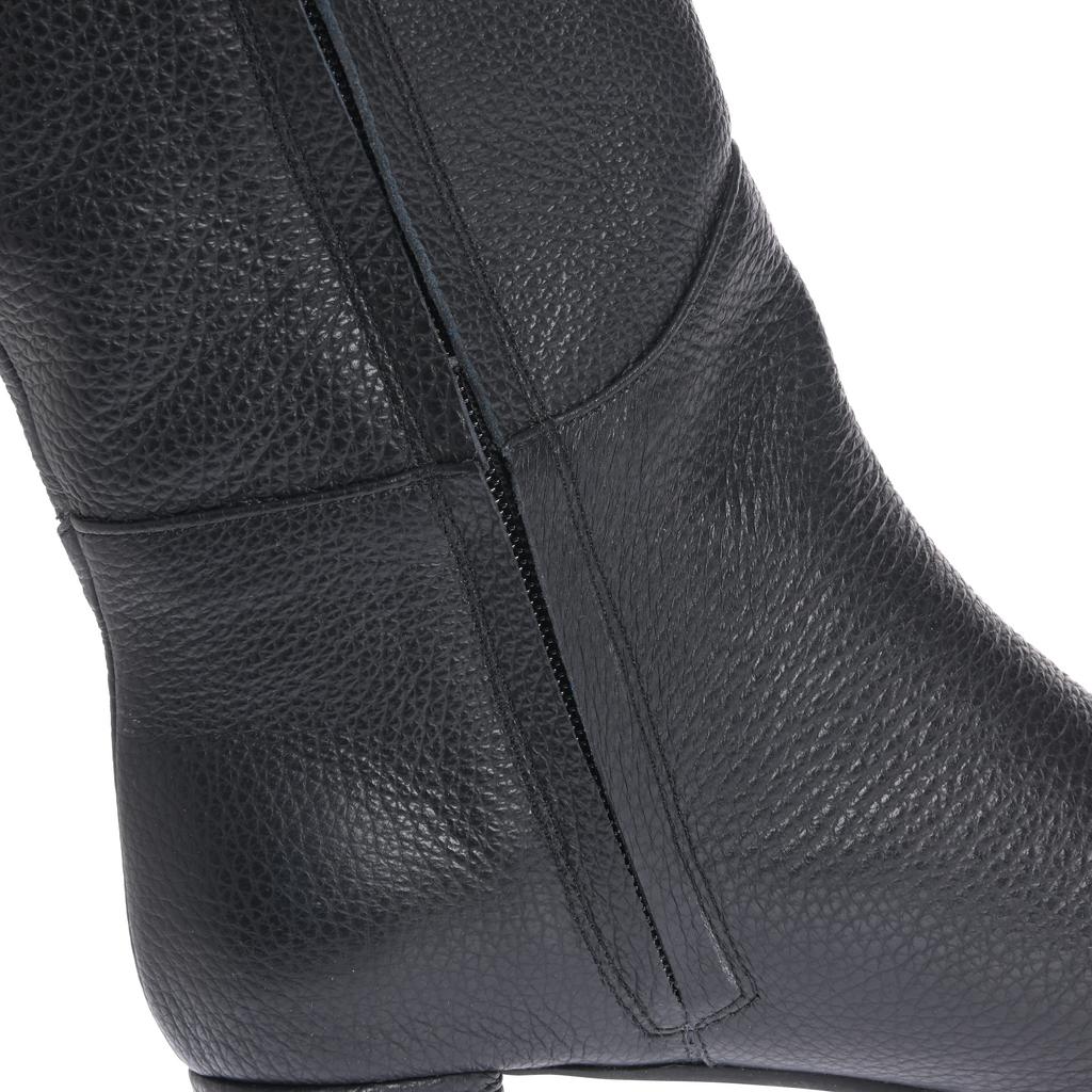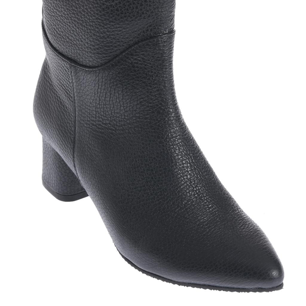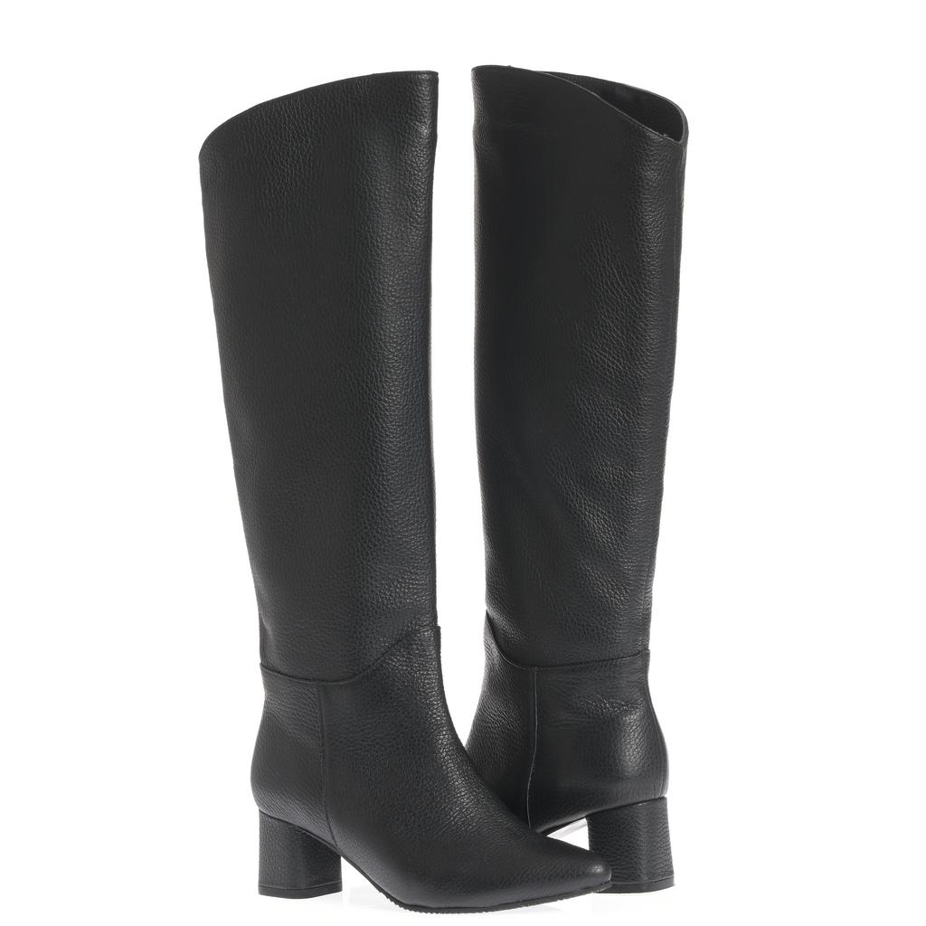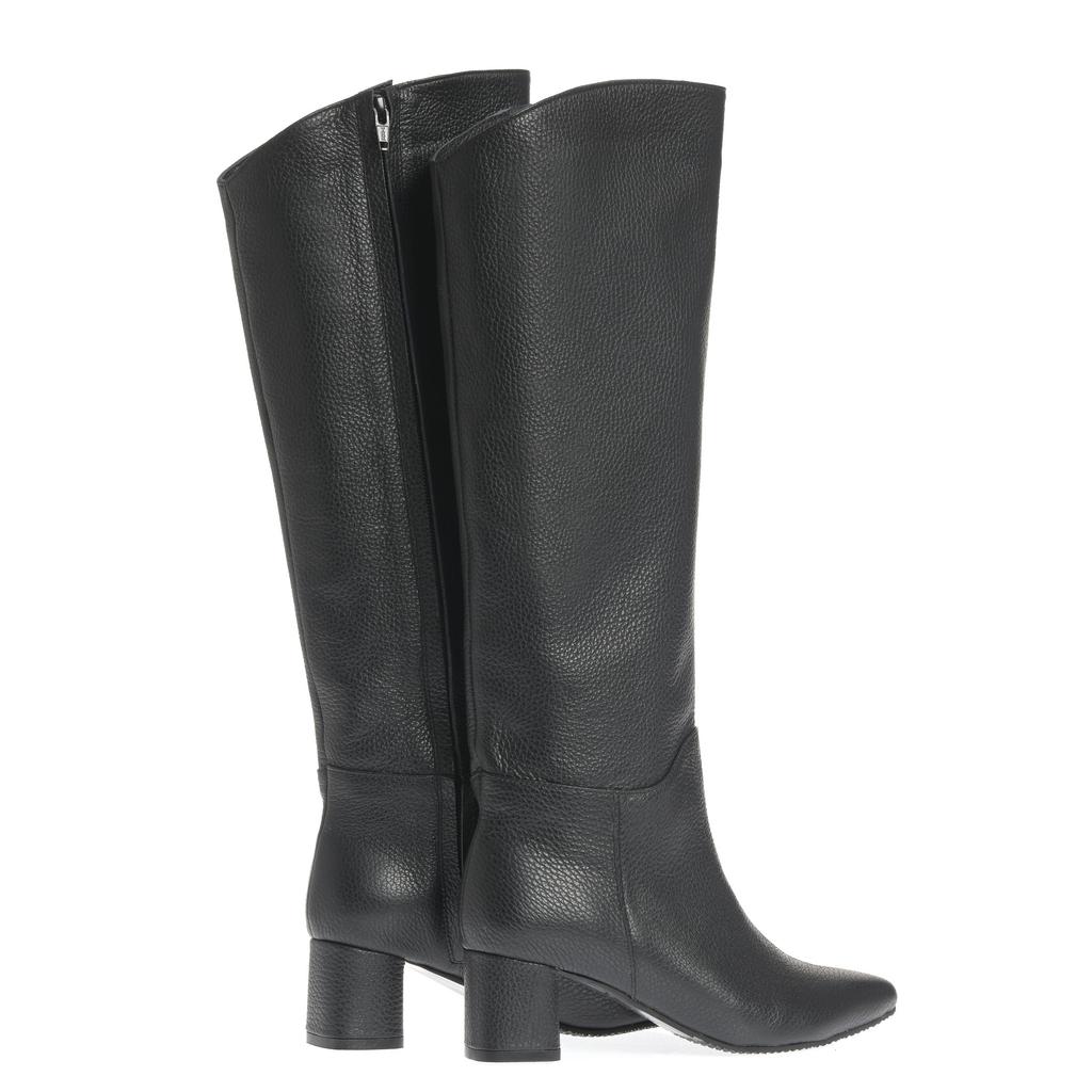 Aceste cizme până la genunchi sunt realizate din piele naturală texturată și au un design minimalist, pus în valoare prin panourile atent conturate și finisajele îngrijite. Vârful ascuțit și tocul gros, de înălțime medie, conturează o siluetă elegantă, potrivită pentru ținute moderne. Fermoarul lateral facilitează încălțarea și fixarea pe picior, iar liniile simple ale modelului le fac ușor de integrat în combinații cu rochii, fuste sau pantaloni mulați, pentru un look rafinat.