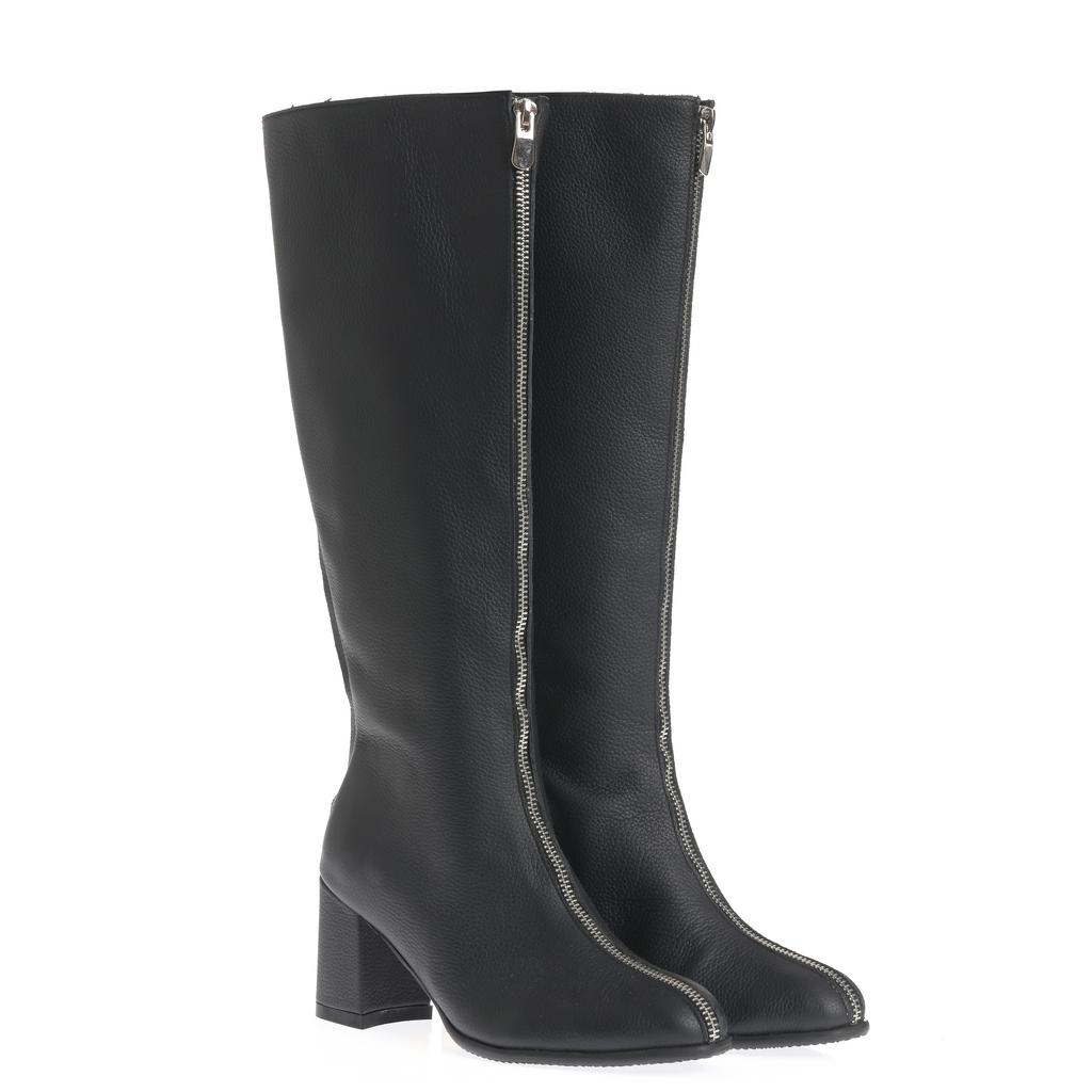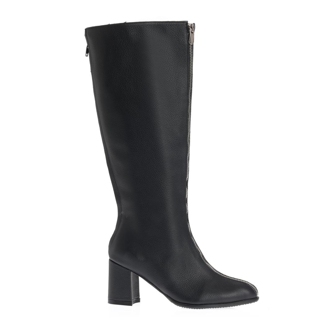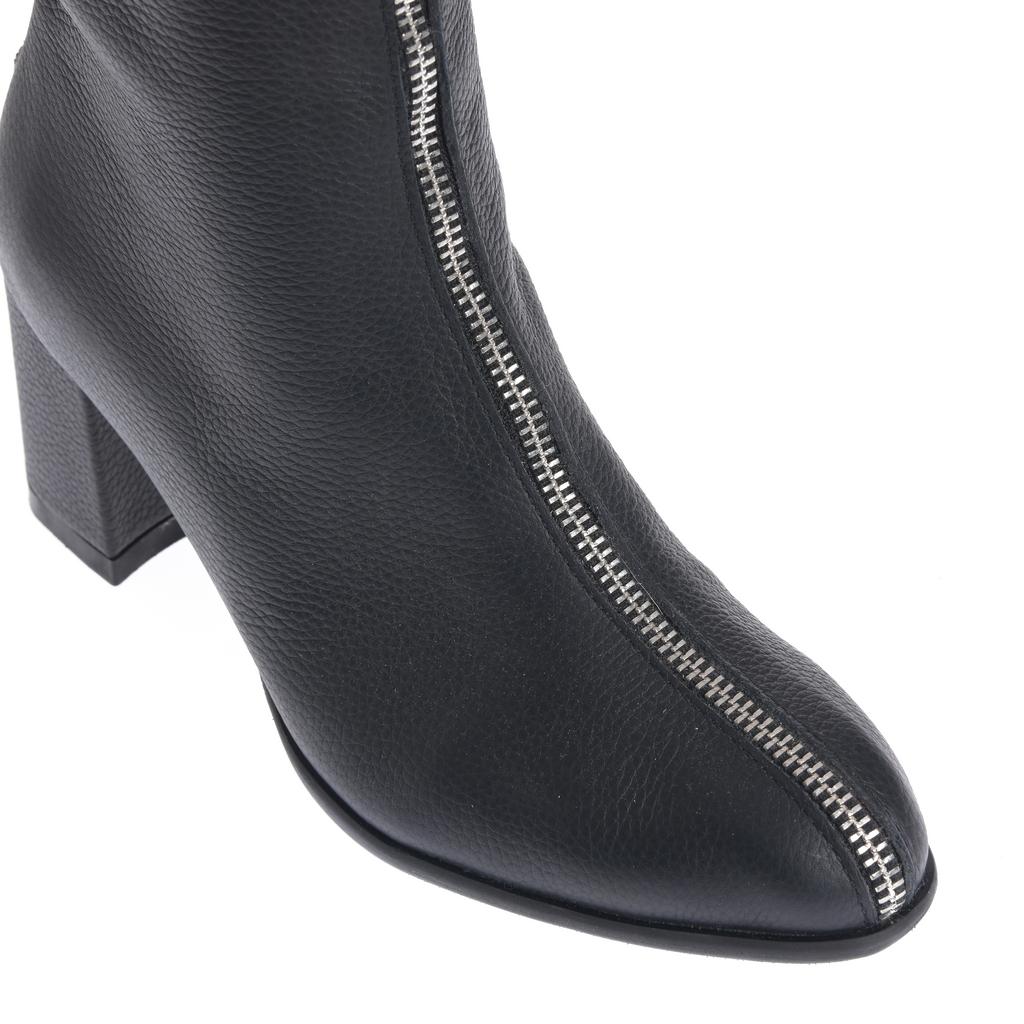 Cizme din piele, cu acoperire înaltă a gleznei și închidere cu fermoar, pentru încălțare rapidă. Tocul gros, de înălțime medie oferă stabilitate la mers. Cusătura vizibilă de-a lungul fermoarului completează designul.