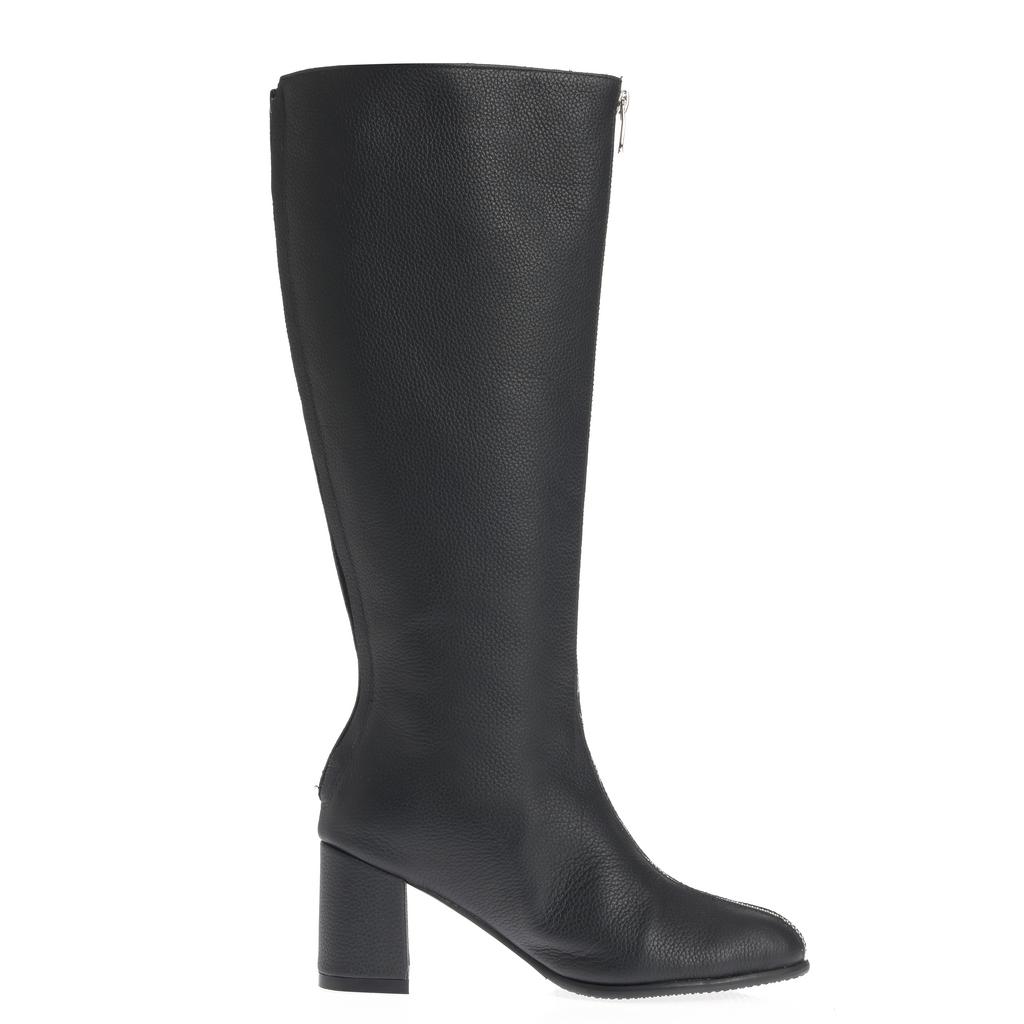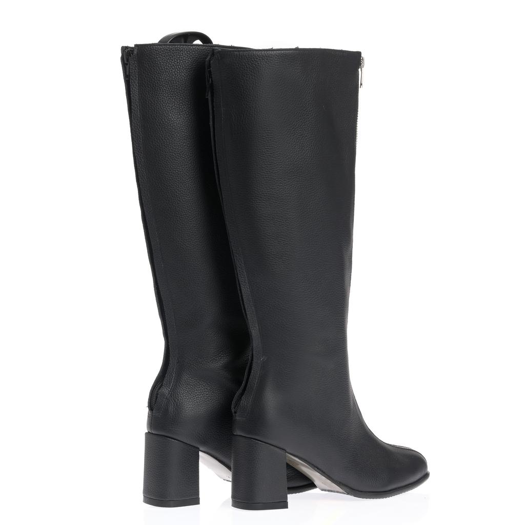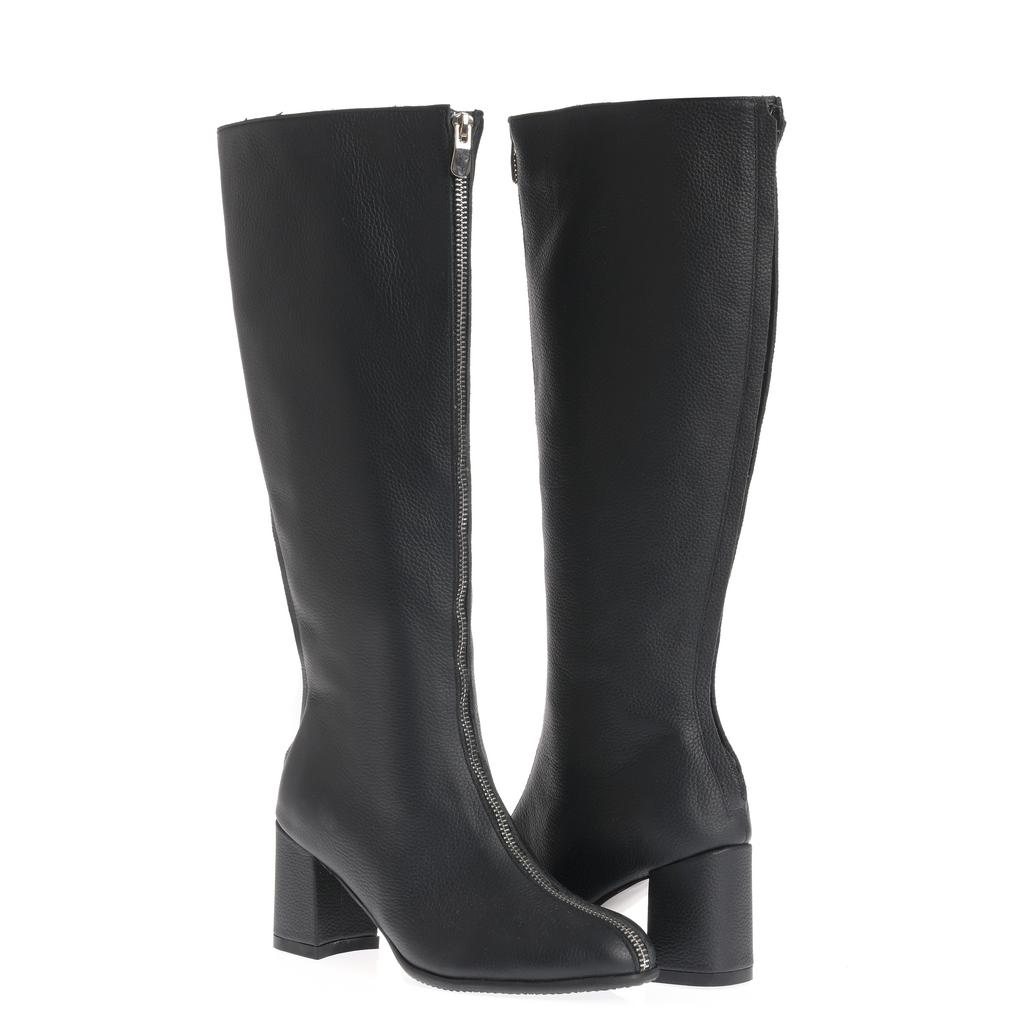 Cizme din piele, cu acoperire înaltă a gleznei și închidere cu fermoar, pentru încălțare rapidă. Tocul gros, de înălțime medie oferă stabilitate la mers. Cusătura vizibilă de-a lungul fermoarului completează designul.
