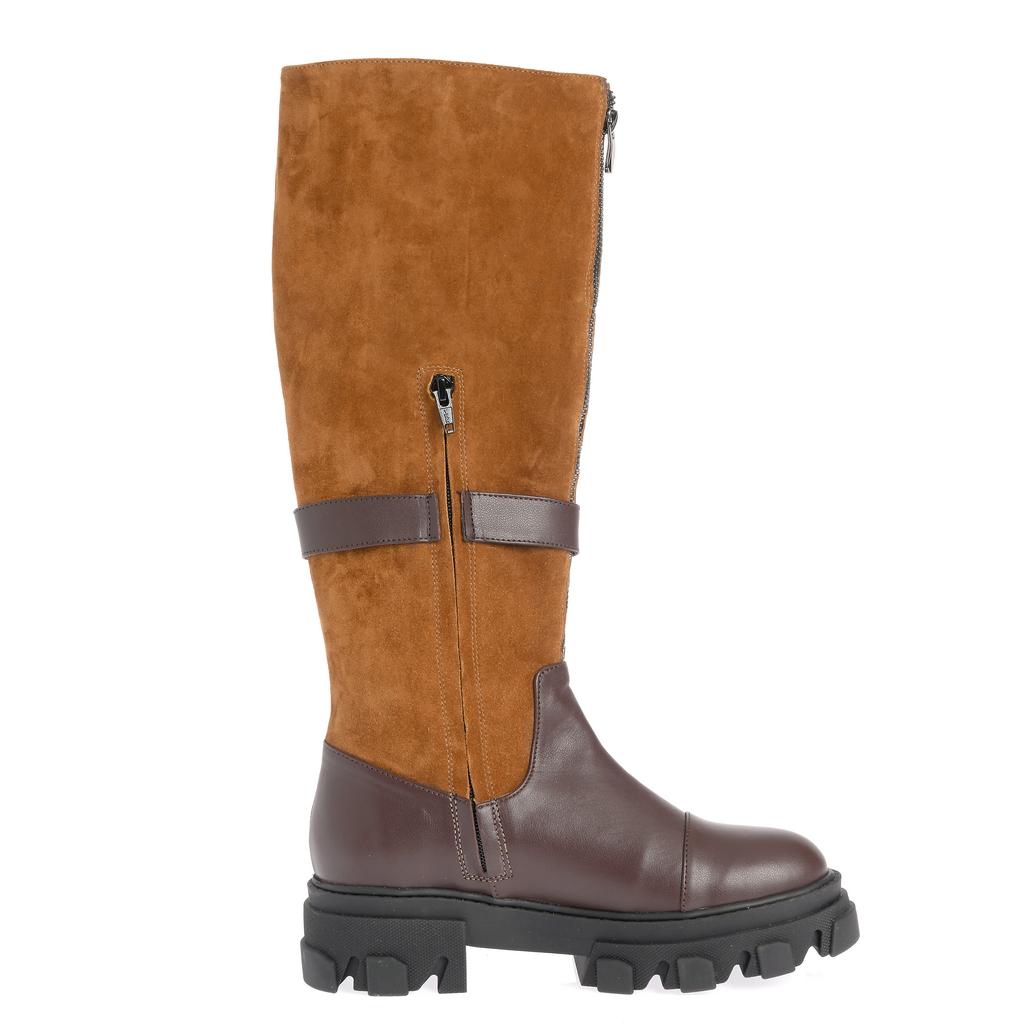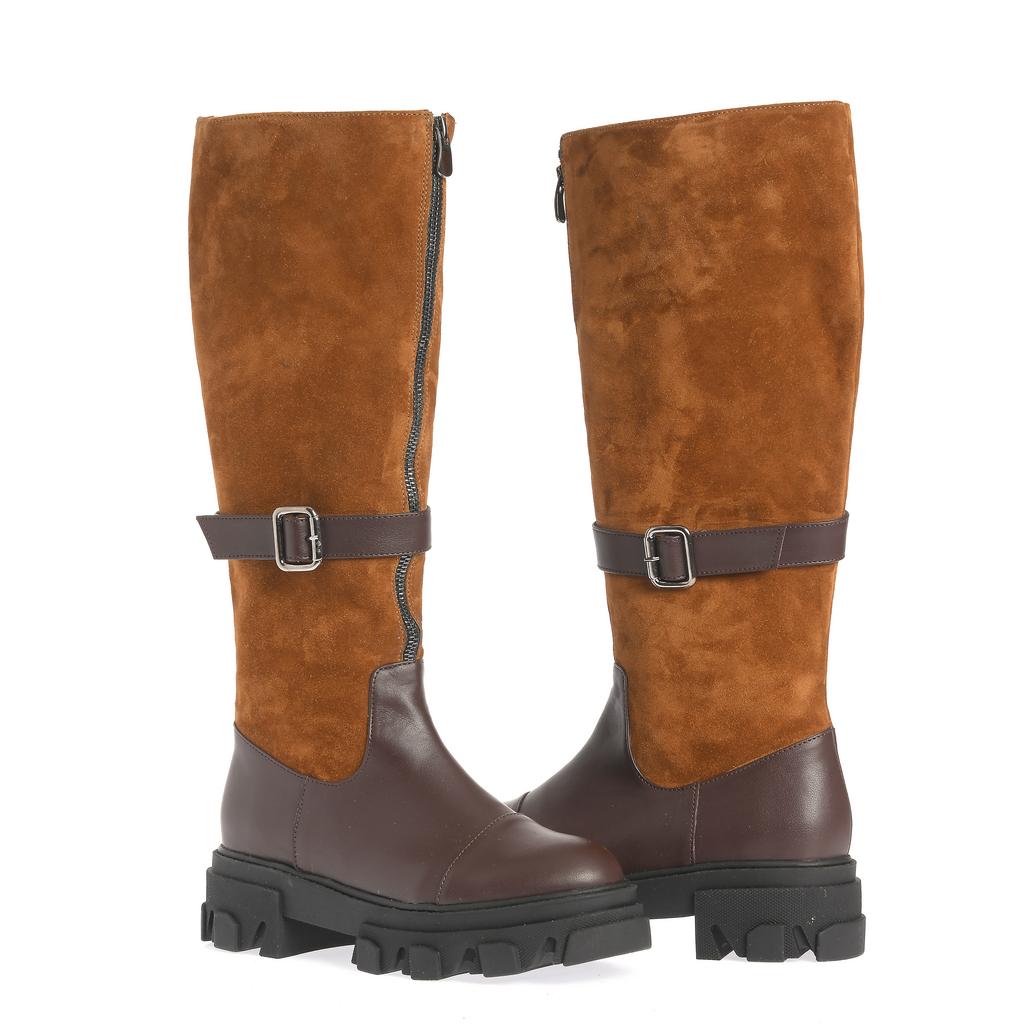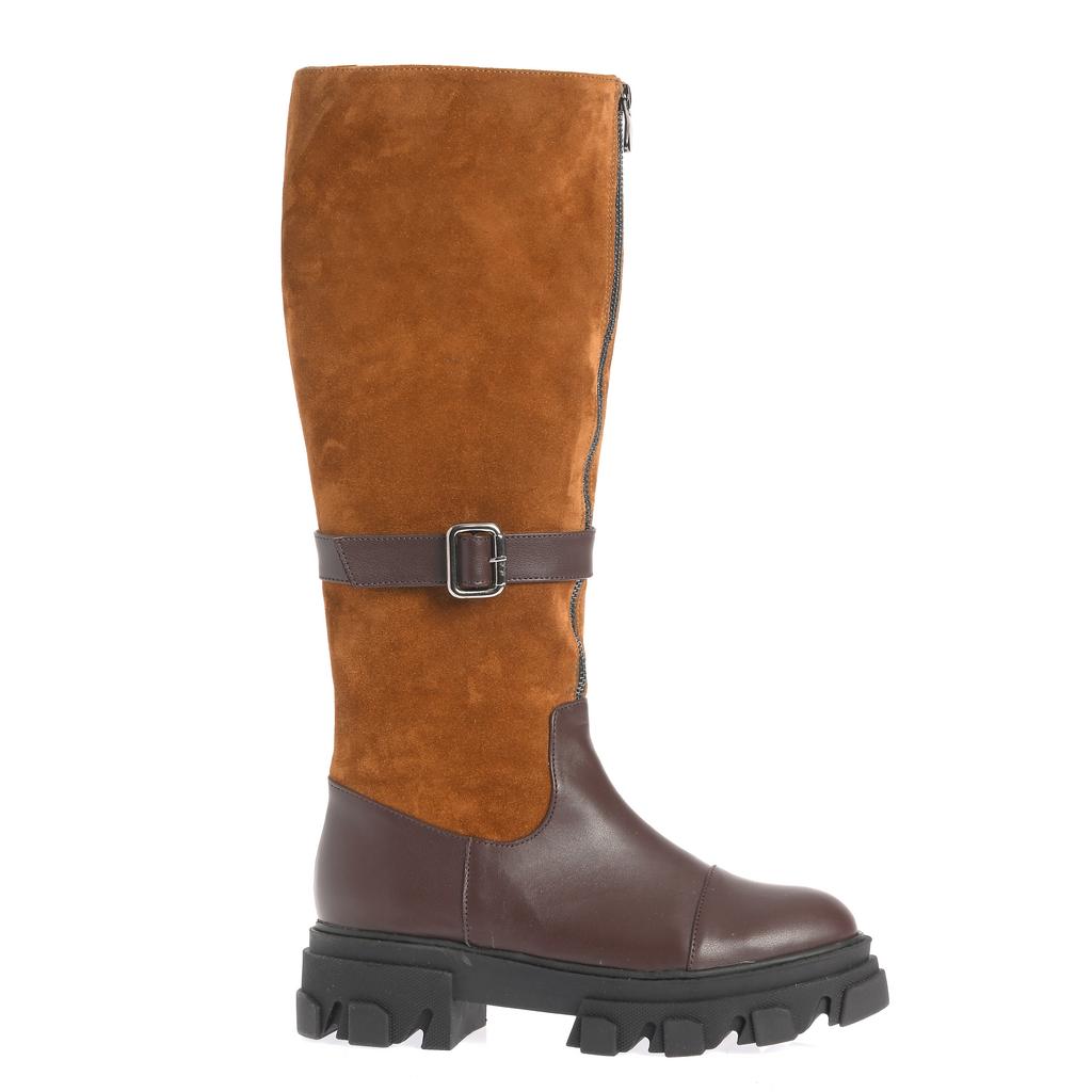 Cizme înalte până la genunchi, din combinație de piele și piele întoarsă, cu fermoar pentru încălțare rapidă. Talpa groasă are un profil pronunțat, care susține stabilitatea la mers, iar detaliul cu cataramă completează designul.