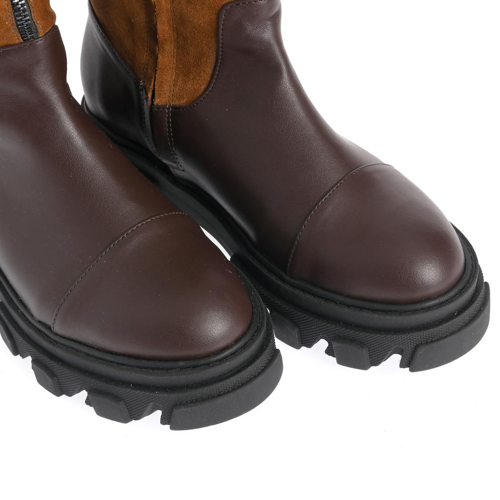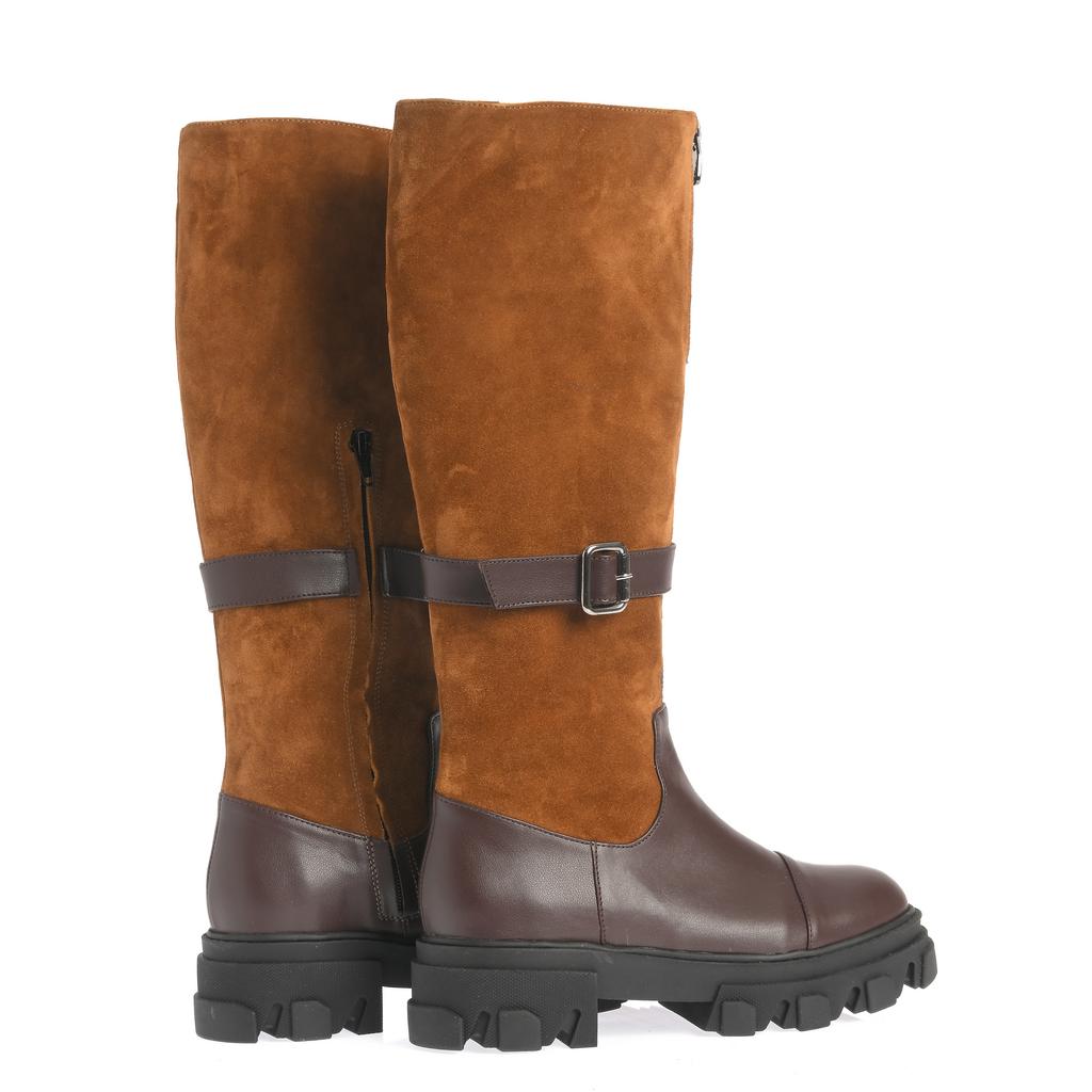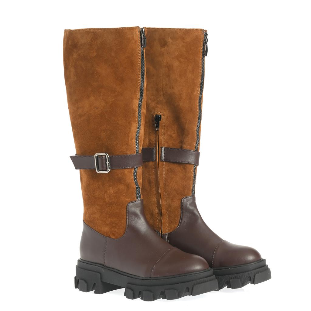 Cizme înalte până la genunchi, din combinație de piele și piele întoarsă, cu fermoar pentru încălțare rapidă. Talpa groasă are un profil pronunțat, care susține stabilitatea la mers, iar detaliul cu cataramă completează designul.
