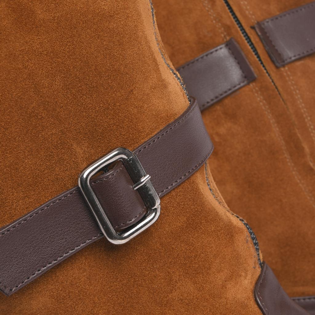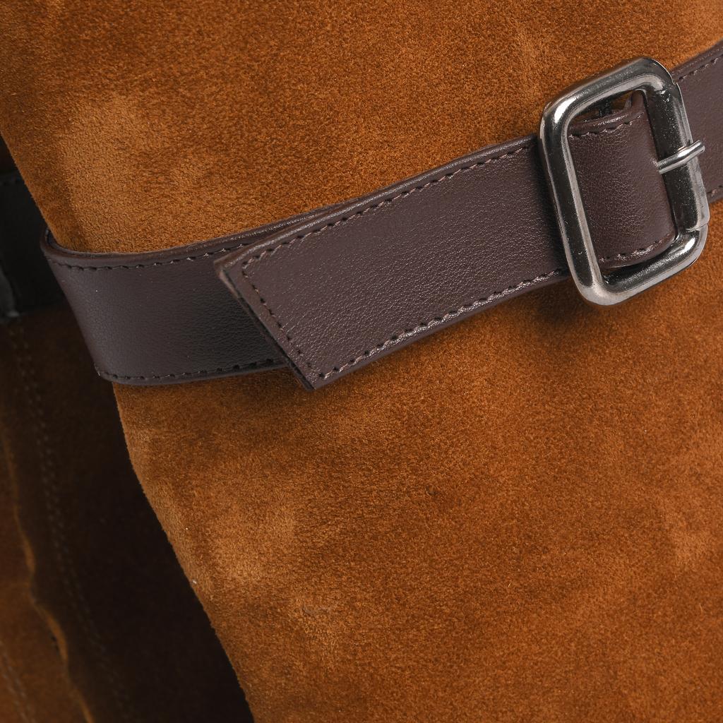 Model înalt, cu acoperire până la genunchi, realizat din piele, piele întoarsă si cusături vizibile pentru un aspect bine definit. Închiderea cu fermoar face încălțarea comodă, iar vârful rotunjit păstrează o linie echilibrată. Talpa groasă oferă stabilitate și confort in timpul mersului. Detaliul cu baretă și cataramă adaugă un accent statement, potrivit pentru ținute moderne de zi.