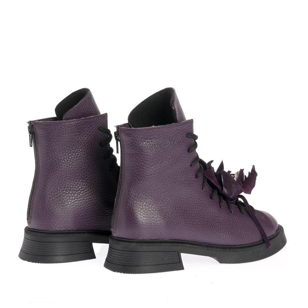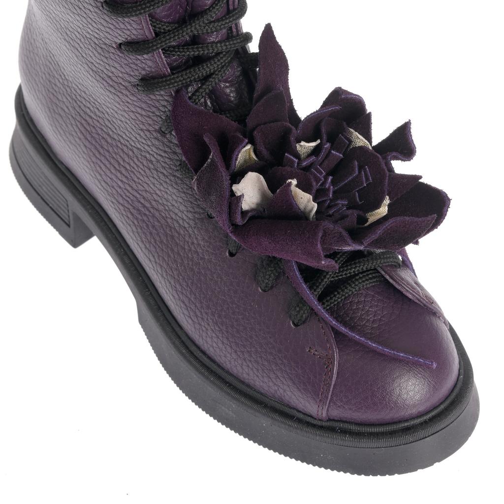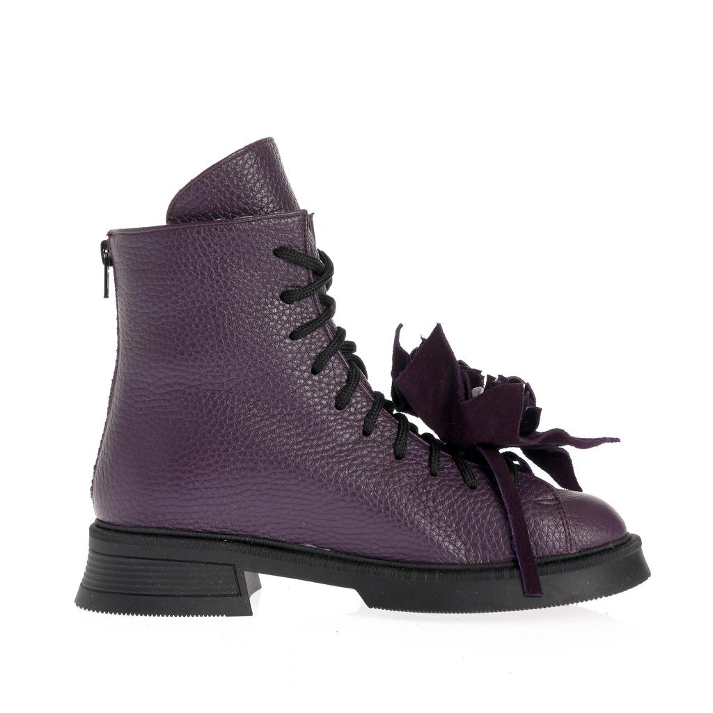Realizate din piele texturată, aceste ghete cu acoperire înaltă a gleznei sunt potrivite pentru ținute moderne, în care vrei un accent bine definit. Talpa plată oferă confort la mers, iar cusăturile vizibile completează designul sofisticat. Sistemul de închidere cu șireturi și fermoar lateral îți permite să le ajustezi ușor și să le încalți rapid. Accesoriile tip floare atașate pe șireturi transformă modelul într-o piesă statement, ușor de integrat în combinații casual și urbane.