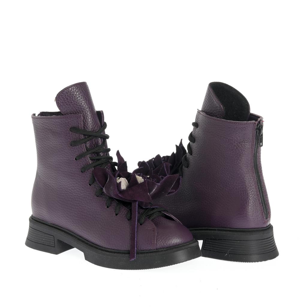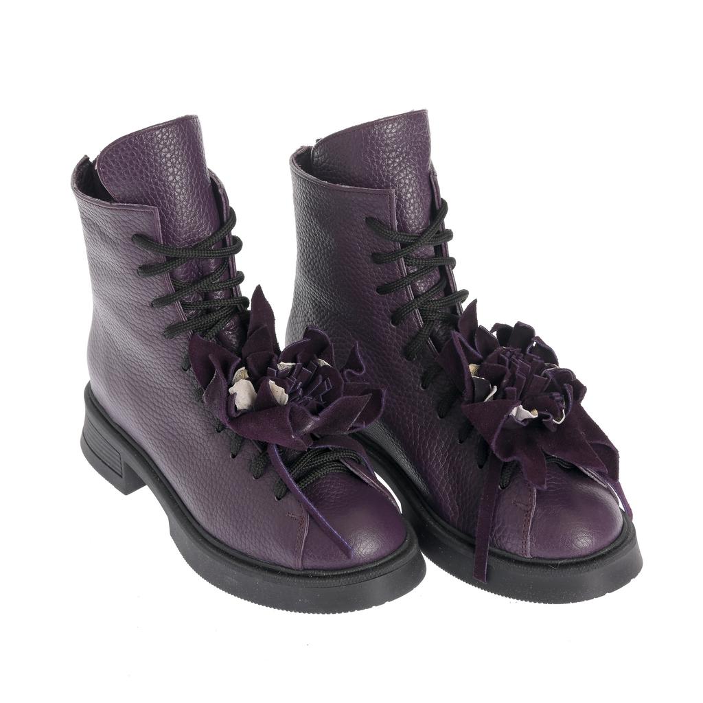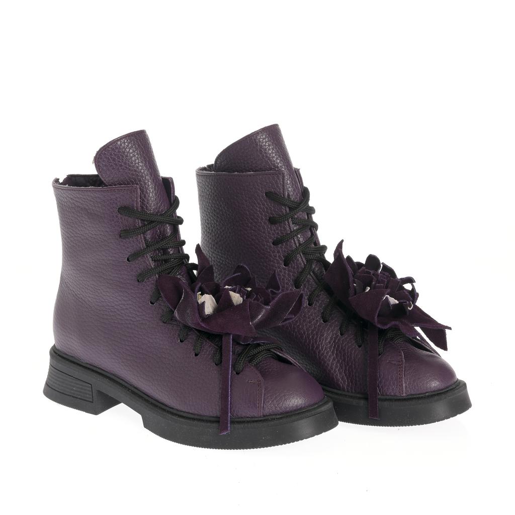 Realizate din piele texturată, aceste ghete cu acoperire înaltă a gleznei sunt potrivite pentru ținute moderne, în care vrei un accent bine definit. Talpa plată oferă confort la mers, iar cusăturile vizibile completează designul sofisticat. Sistemul de închidere cu șireturi și fermoar lateral îți permite să le ajustezi ușor și să le încalți rapid. Accesoriile tip floare atașate pe șireturi transformă modelul într-o piesă statement, ușor de integrat în combinații casual și urbane.