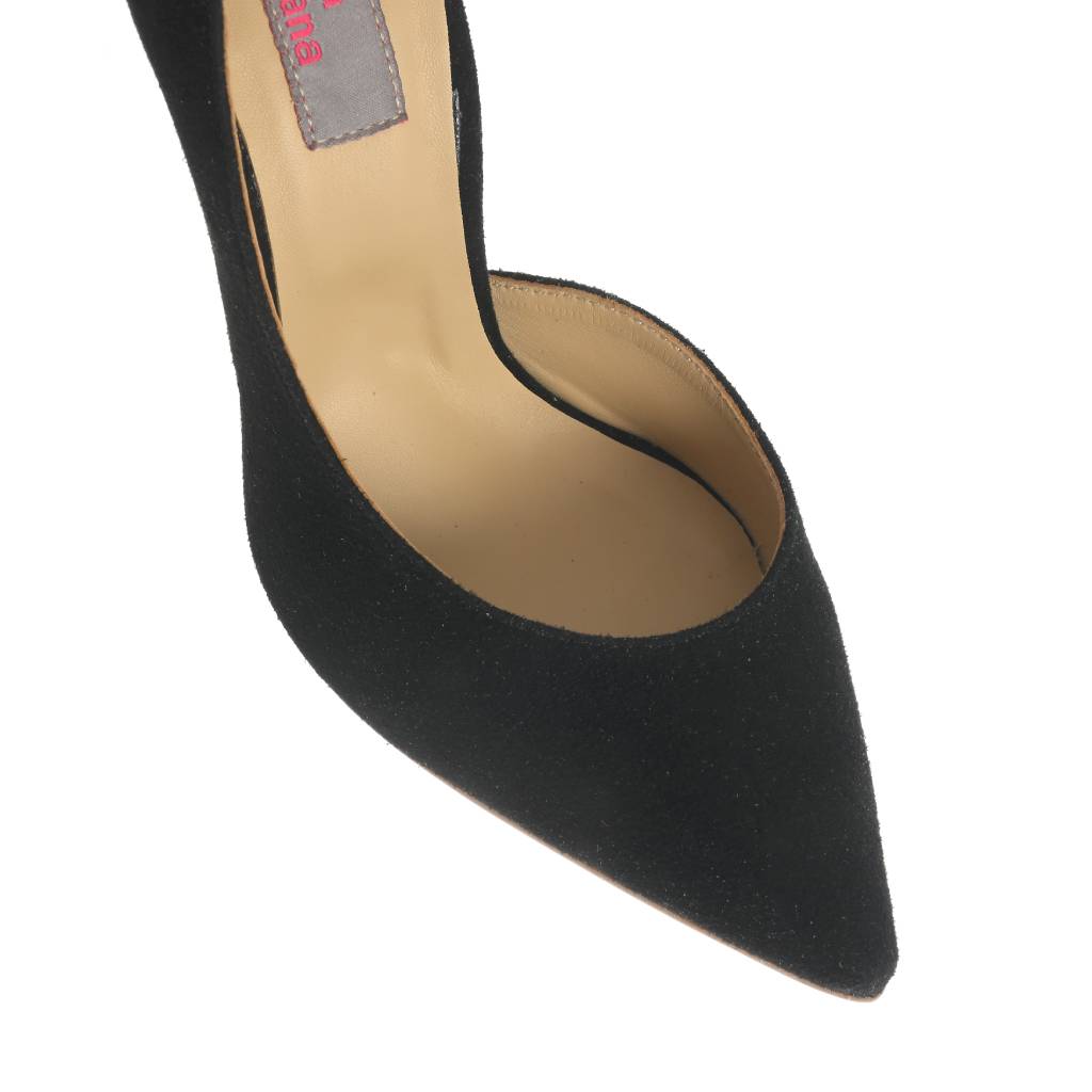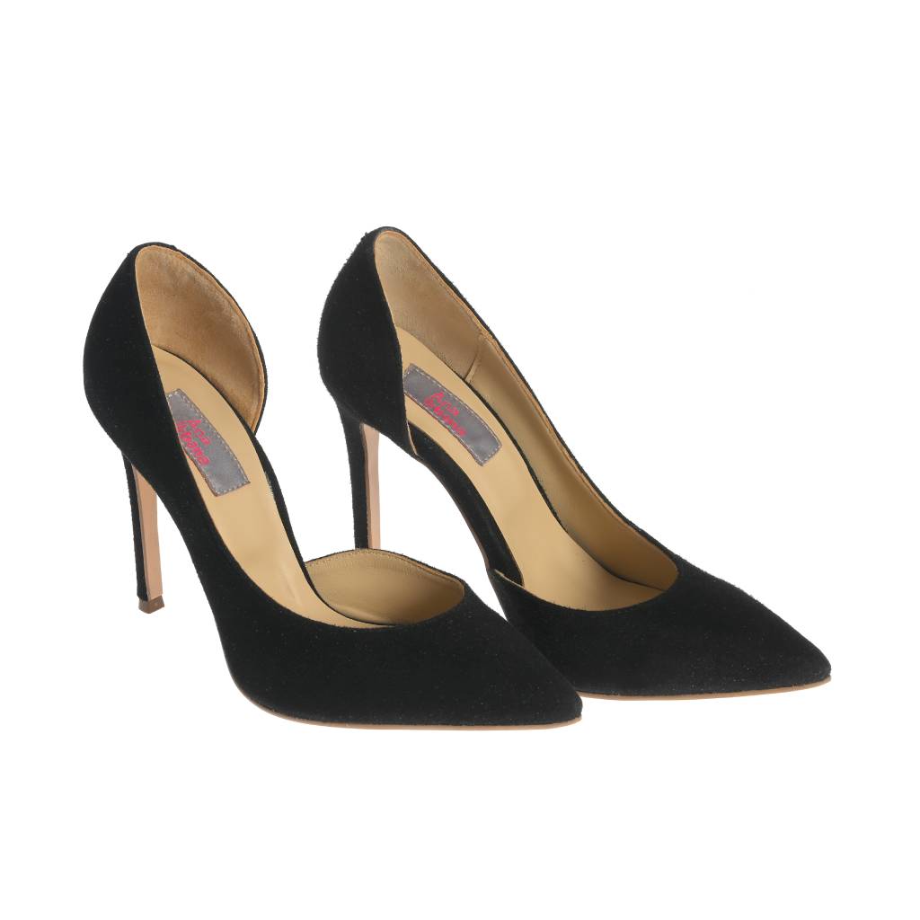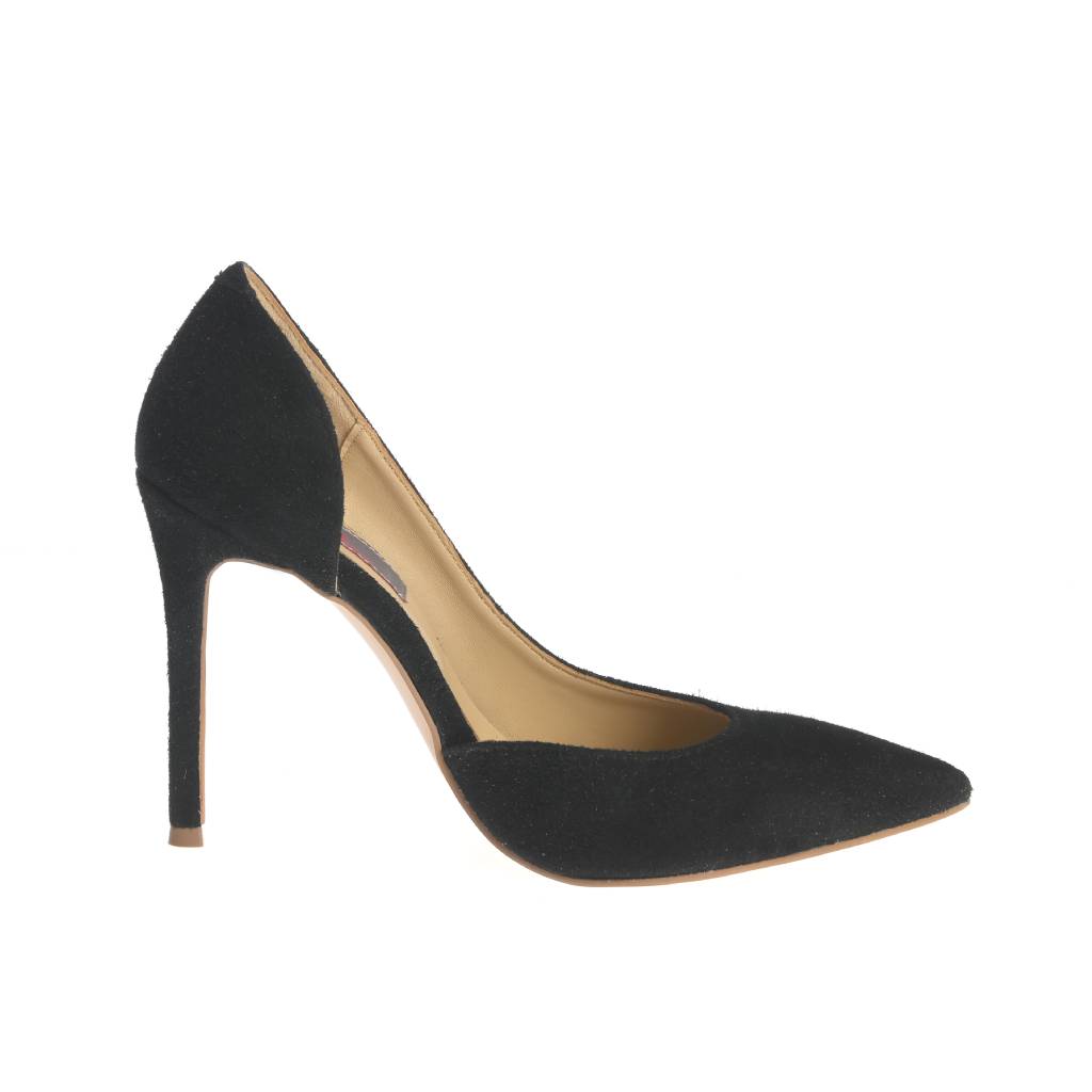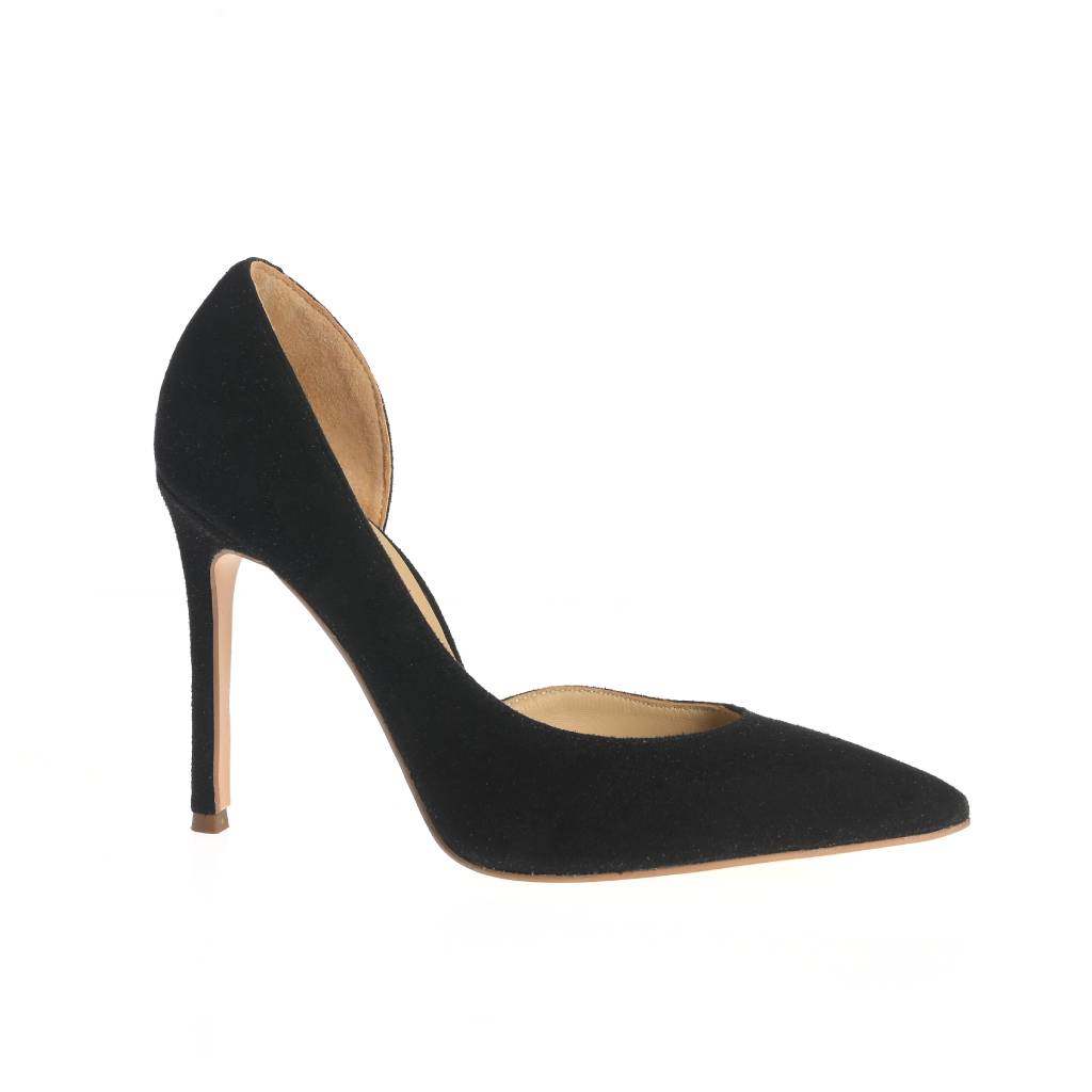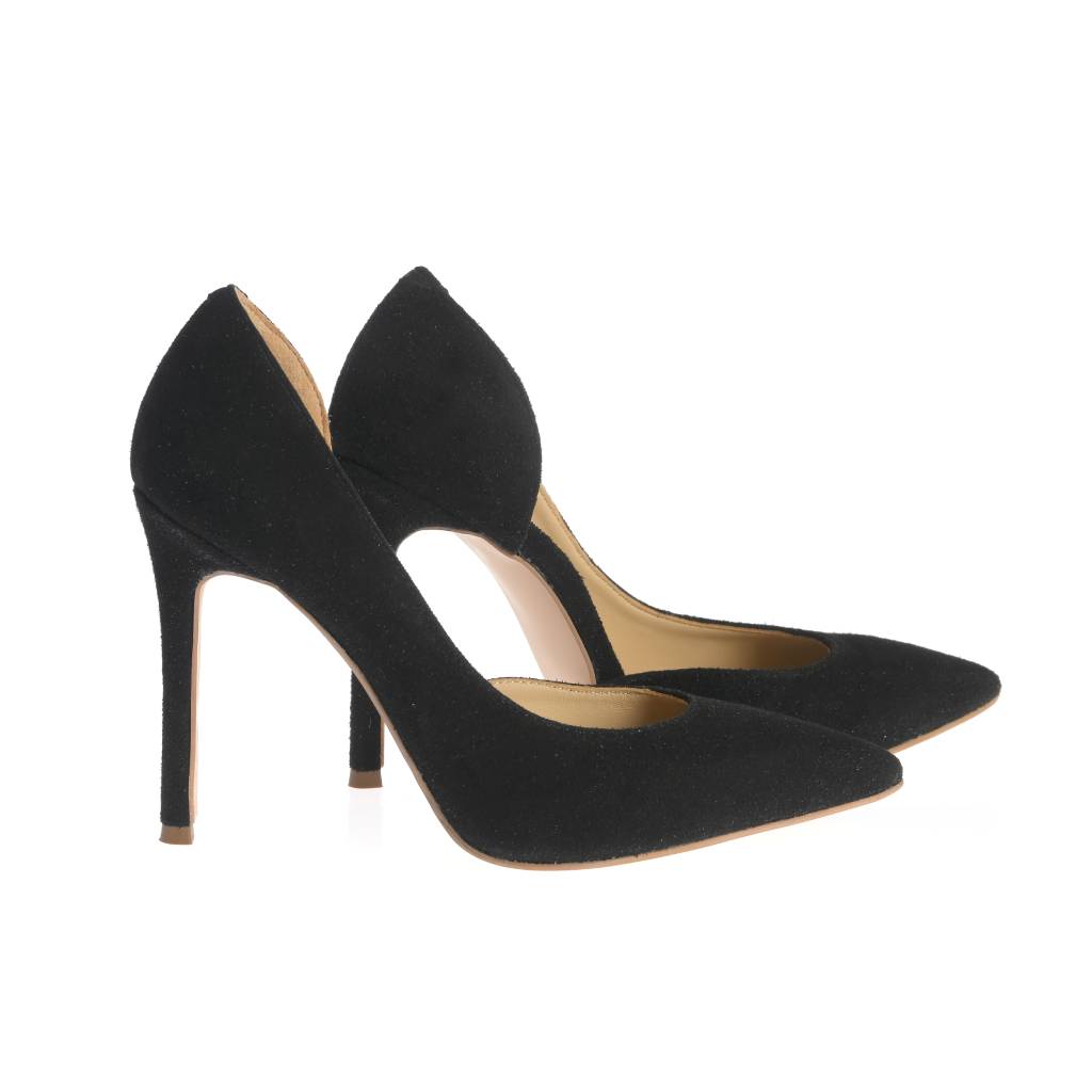 Perfecți pentru ținute elegante și rafinate, acești pantofi din piele întoarsă, cu vârf ascuțit și toc înalt tip stiletto se încalță rapid. Decolteul interior reprezintă un detaliu feminin, potrivit pentru apariții de seară sau evenimente speciale. Talpa subțire completează linia fină a modelului și pune accent pe stil și pe un look sofisticat.