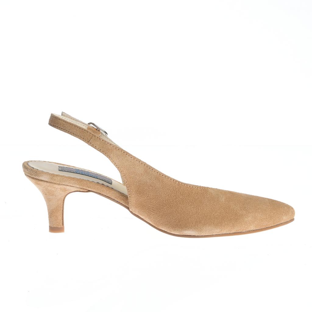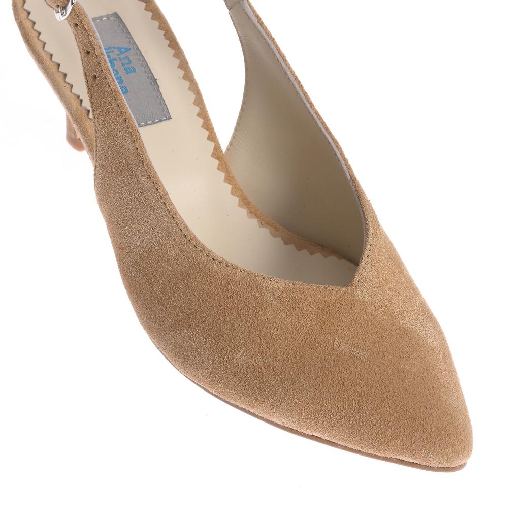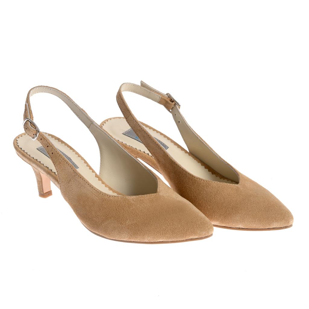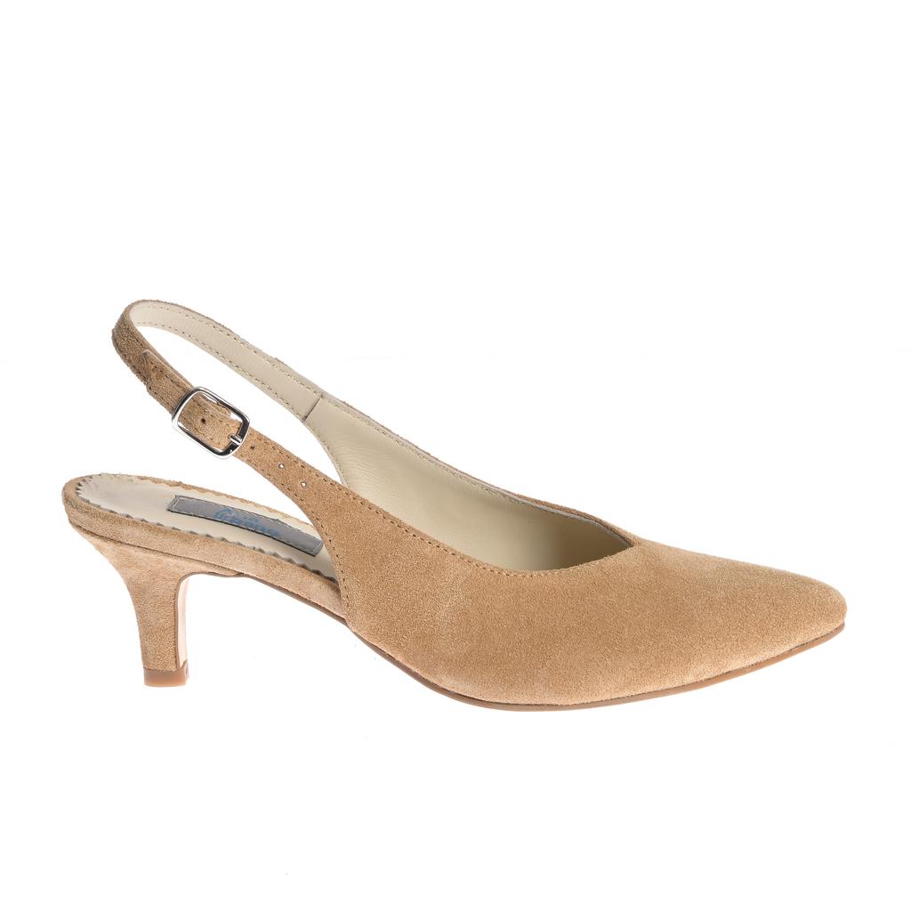 Model slingback cu vârf ascuțit și toc mic subțire, potrivit pentru ținute moderne, de la evenimente la ocazii mai formale. Partea superioară din piele întoarsă are finisaj neted și cusături vizibile pe margine, pentru un aspect elegant. Bareta slingback cu cataramă asigură o fixare stabilă, iar branțul cu padding vizibil, cu logo, oferă un plus de confort. Talpa susține linia elegantă a pantofului și asigură o purtare plăcută.