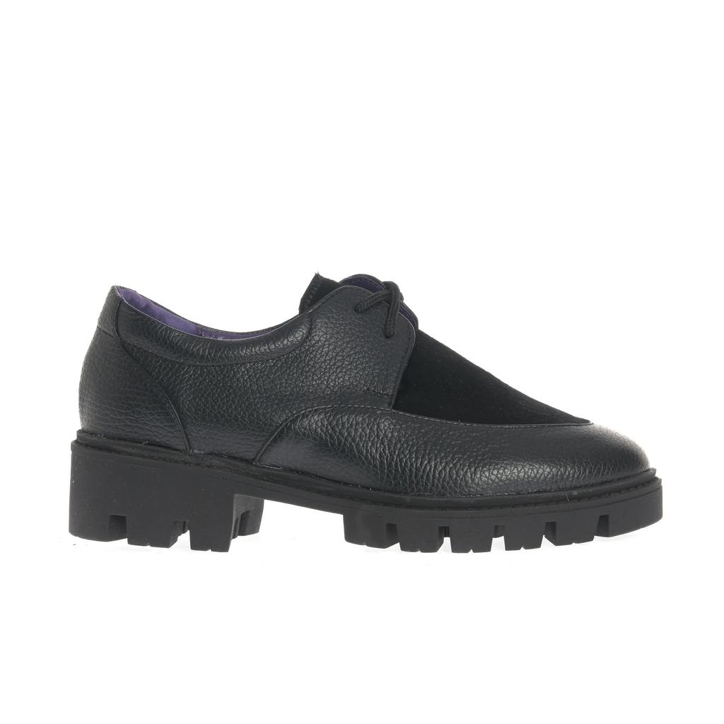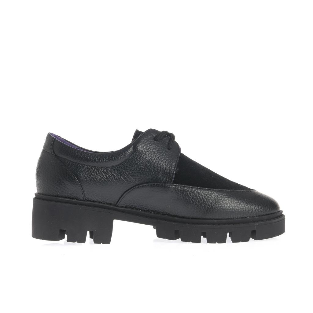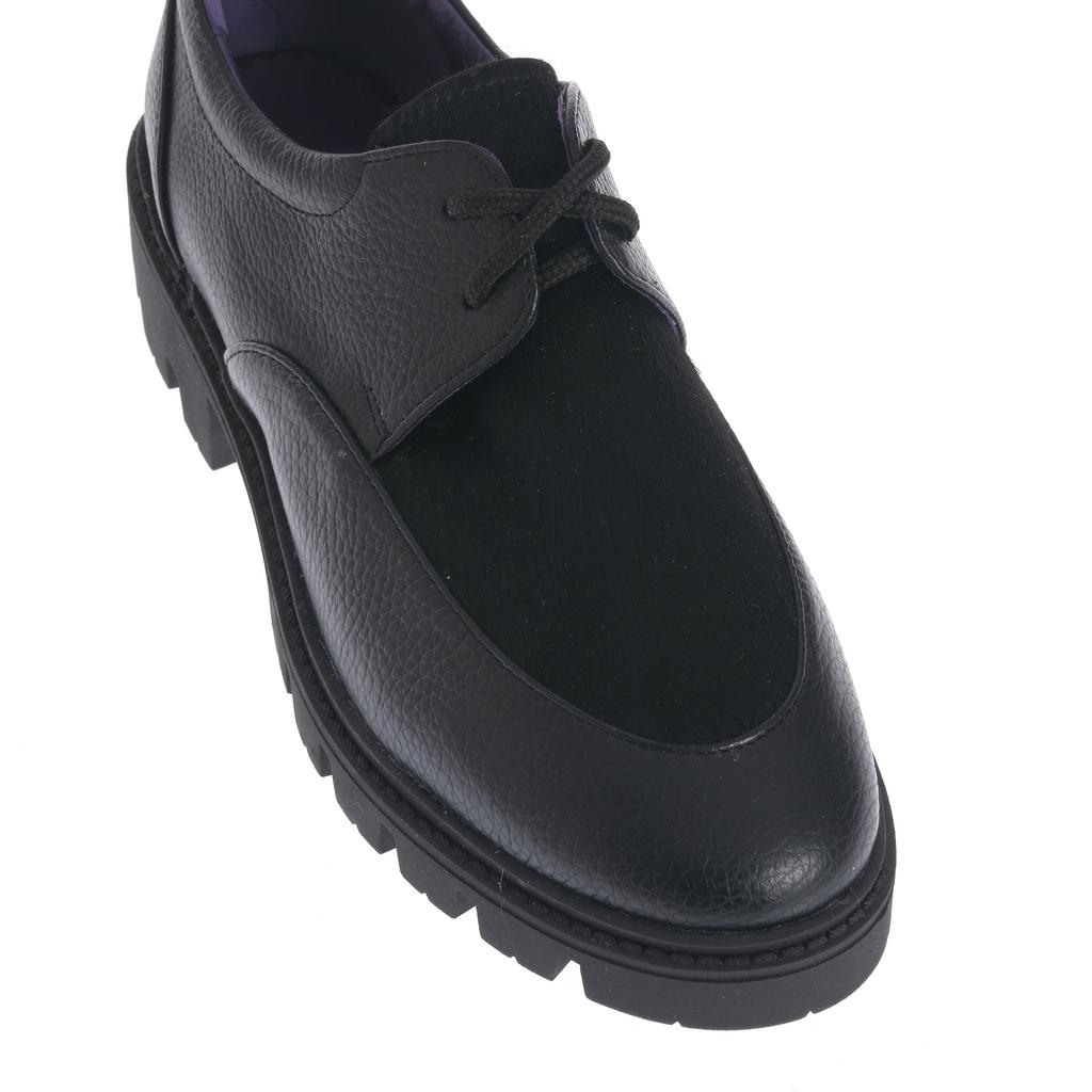 Model Derby realizat din piele cu textură granulată combinată cu piele întoarsă, pentru un aspect bine definit și ușor de asortat. Închiderea cu șireturi și vârful rotunjit păstrează linia clasică, potrivită pentru ținute moderne, de zi cu zi. Talpa chunky, cu model tip crampoane, oferă stabilitate, iar cusăturile vizibile de pe partea superioară conturează construcția. Căptușeala colorată aduce un detaliu discret de contrast.