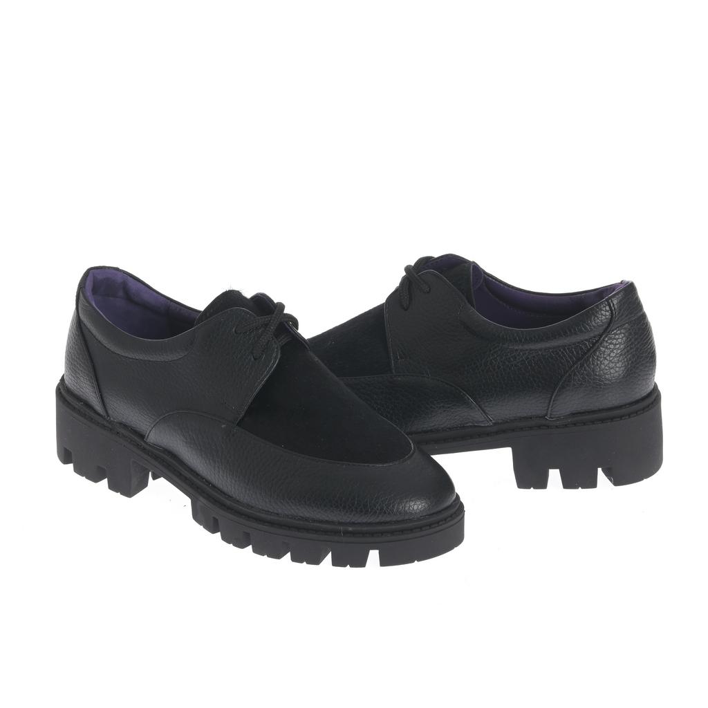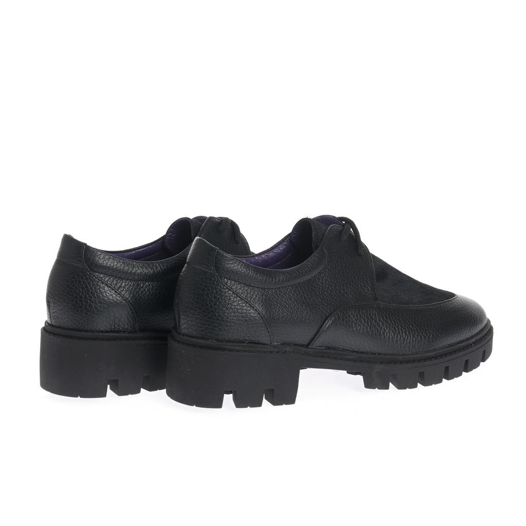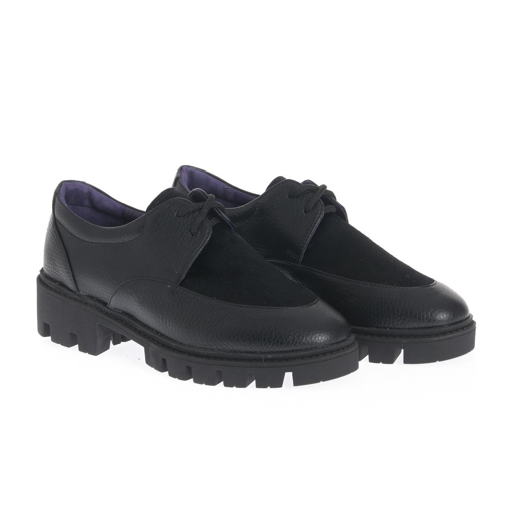 Model Derby realizat din piele cu textură granulată combinată cu piele întoarsă, pentru un aspect bine definit și ușor de asortat. Închiderea cu șireturi și vârful rotunjit păstrează linia clasică, potrivită pentru ținute moderne, de zi cu zi. Talpa chunky, cu model tip crampoane, oferă stabilitate, iar cusăturile vizibile de pe partea superioară conturează construcția. Căptușeala colorată aduce un detaliu discret de contrast.