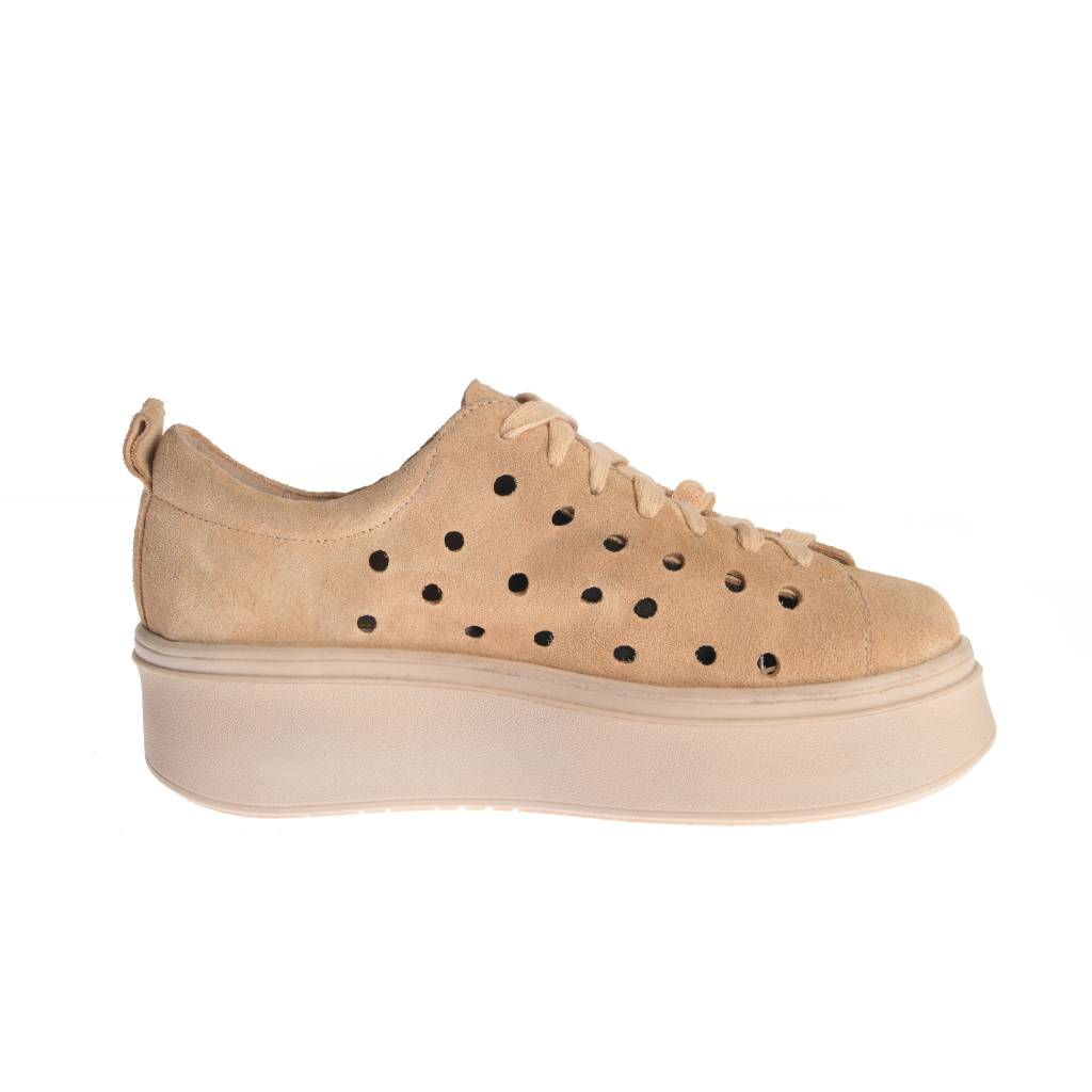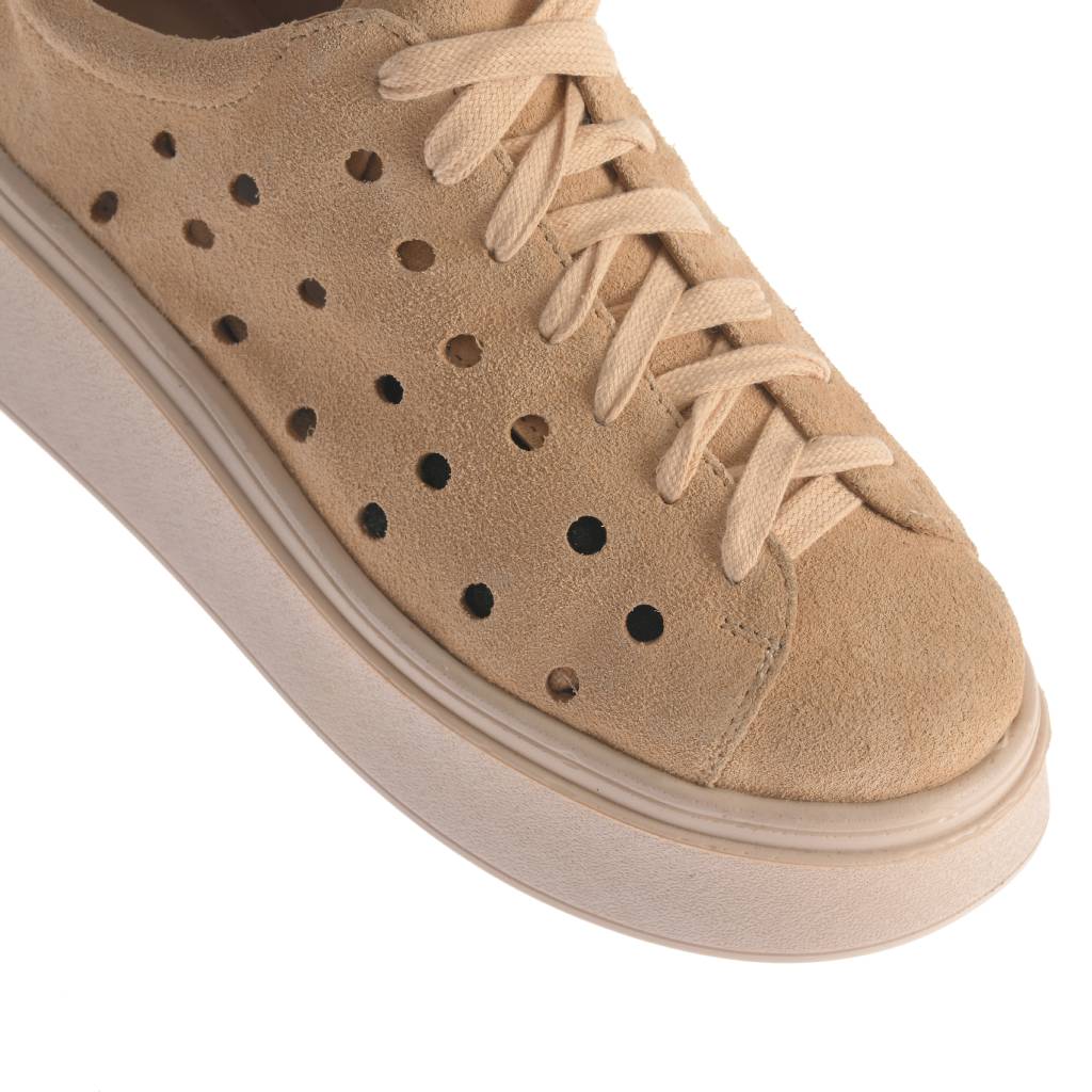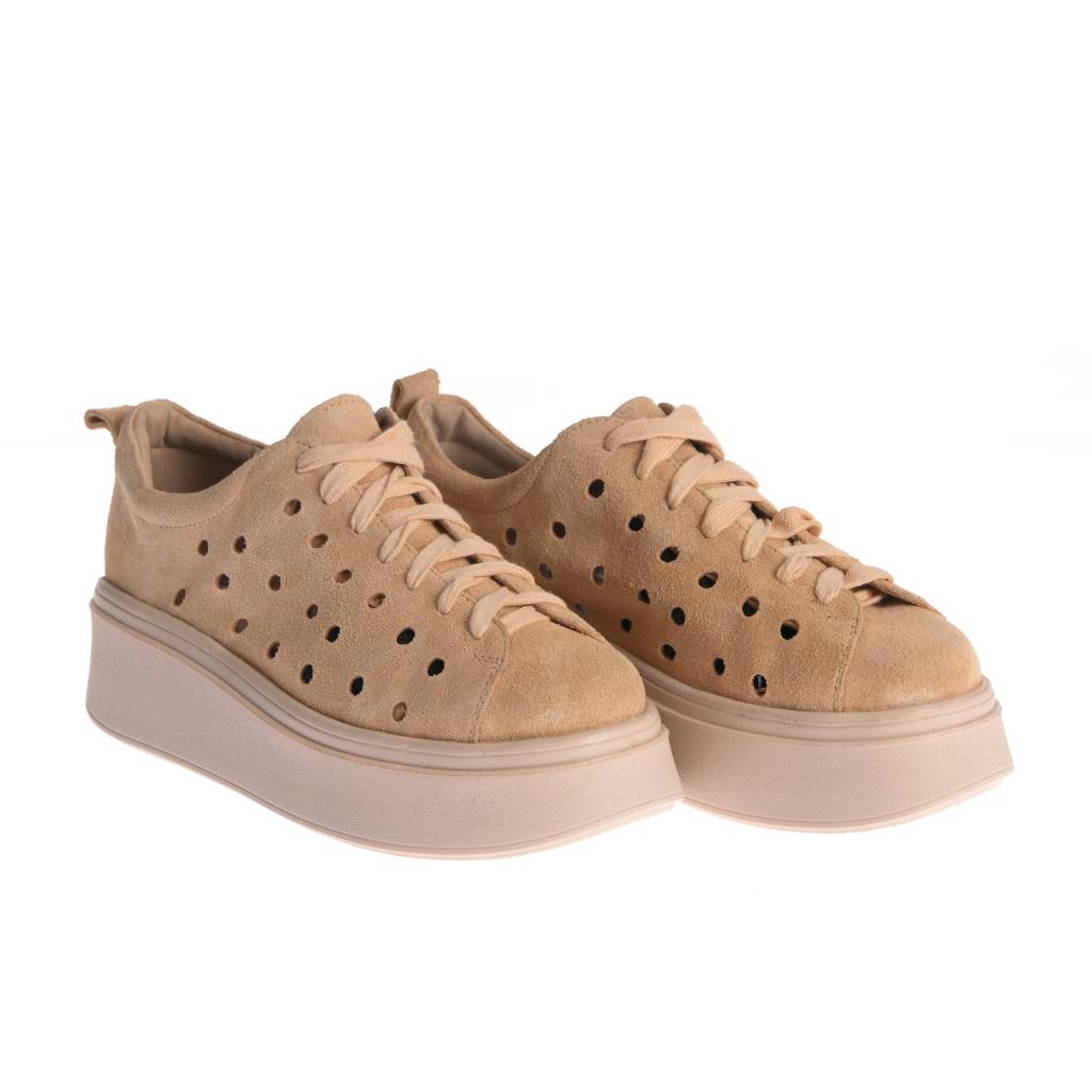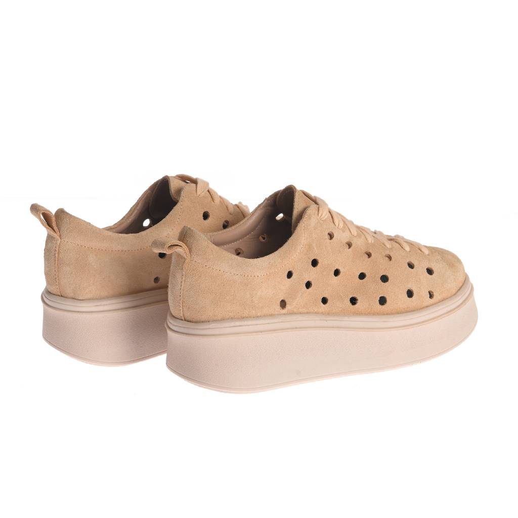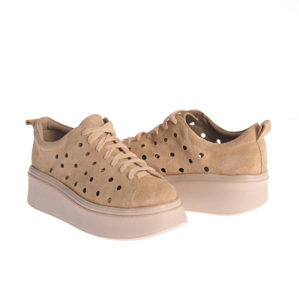 Model casual cu șiret, realizat din piele întoarsă și gândit pentru ținute moderne. Perforațiile adaugă un plus de aerisire, iar designul este completat de cusături vizibile în jurul părții superioare. Talpa groasă, cu platformă ,oferă confort la purtare și evidențiază silueta, fiind ușor de integrat în combinații de zi cu zi, la rochii, fuste sau pantaloni Croiala joasă, cu vârf rotunjit, îl face potrivit pentru plimbări și ieșiri relaxate.