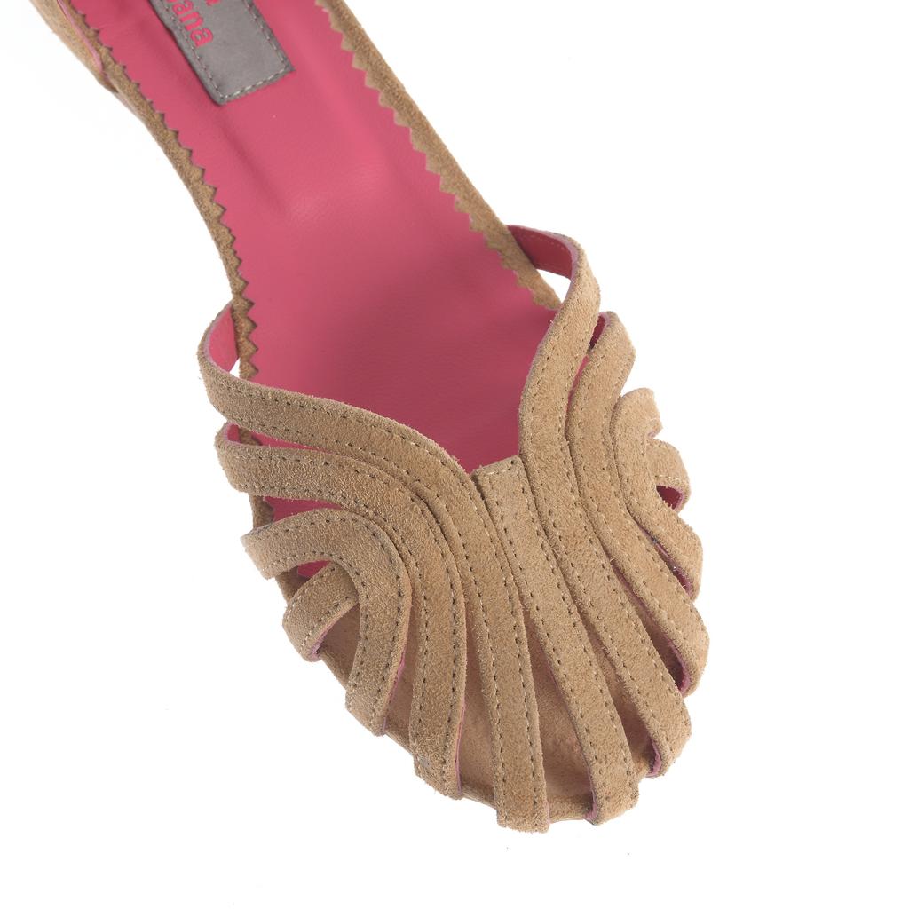 Model cu barete decorative și decupaje atent conturate, completat de cusături vizibile pentru un aspect îngrijit. Partea superioară din piele întoarsă evidențiază linia feminină a pantofului, iar închiderea cu baretă la gleznă și cataramă oferă susținere și stabilitate la mers. Designul este potrivit pentru purtare zilnică, în ținute casual.
